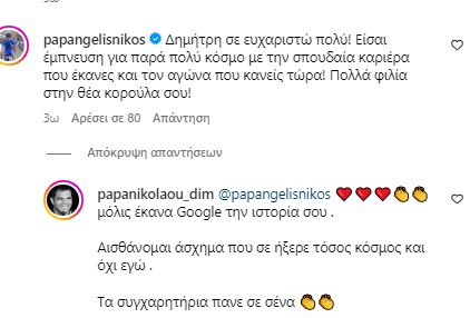 “Δημήτρη σε ευχαριστώ πολύ! Είσαι έμπνευση για παρά πολύ κόσμο με την σπουδαία καριέρα που έκανες και τον αγώνα που κανείς τώρα! Πολλά φιλιά στην θεά κορούλα σου!