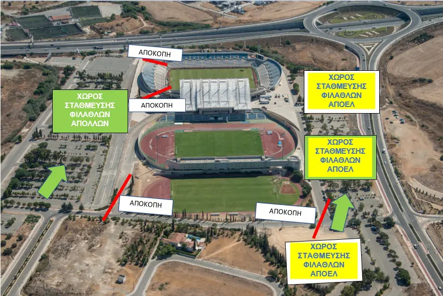 Οι φίλαθλοι του ΑΠΟΕΛ θα καταλάβουν τις Δυτικές, Νότιες και Ανατολικές κερκίδες του σταδίου, ως εκ τούτου, προτρέπονται να κατευθυνθούν στο στάδιο μέσω των φώτων Τροχαίας «Καλησπέρα» και ακολούθως από τον υπερυψωμένο κυκλικό κόμβο ΓΣΠ δεξιά προς Νότιες, Ανατολικές και Δυτικές κερκίδες. Να σταθμεύσουν τα οχήματα τους στον Δυτικό και στον Νότιο χώρο στάθμευσης.