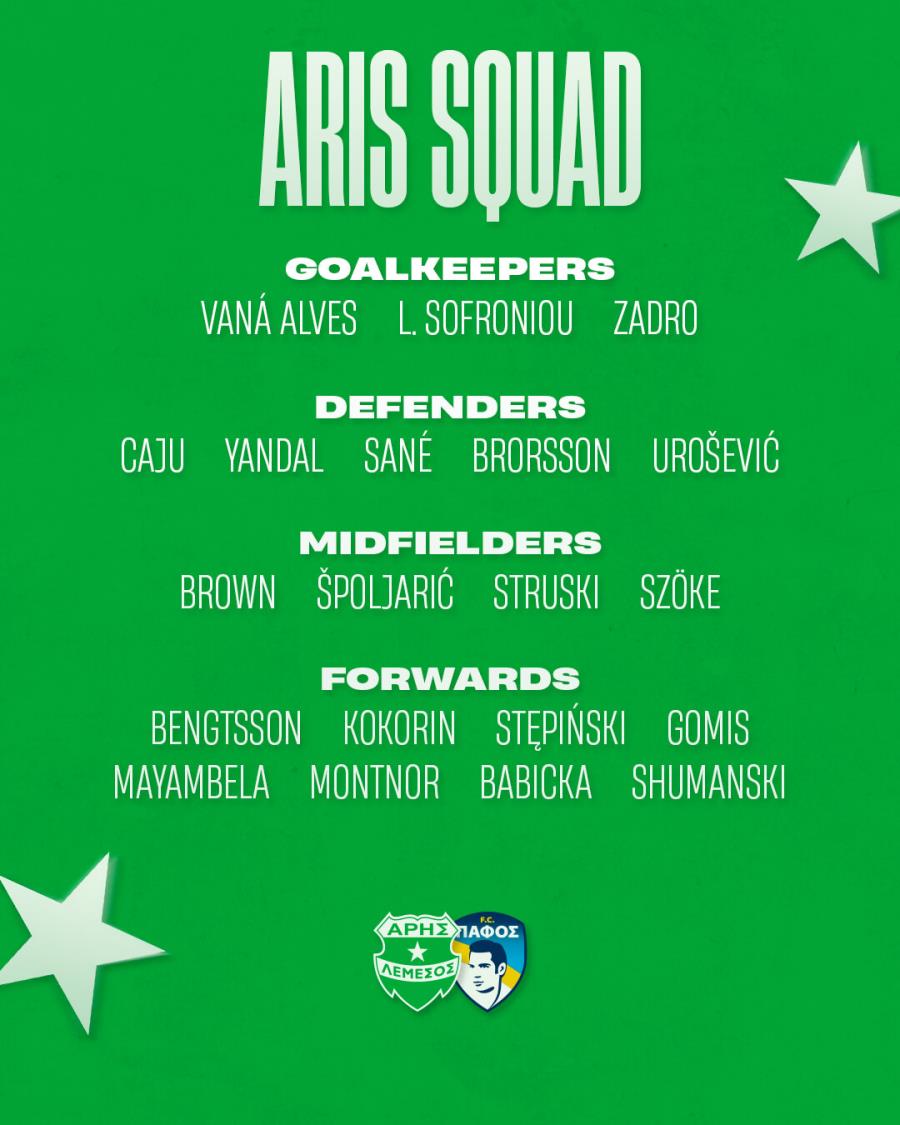Ο Άρης ανακοίνωσε την αποστολή για το σημερινό μεγάλο ματς κόντρα στην Πάφο στο στάδιο "Άλφαμέγα". Εκτός έμειναν οι Γιαγκό, Μουσούντα και Μποακί.