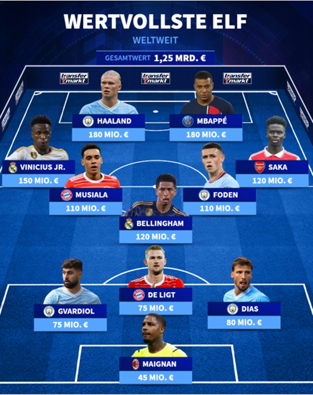 Επίσης η πιο ακριβή ενδεκάδα στον κόσμο αξίζει τώρα  1,25 δισεκατομμύρια ευρώ: Μάικ Μενιάν (Μίλαν-45 ευρώ)- Γιόσκο Γκβάρντιολ (Μάντσεστερ Σίτι-75), Ματάις ντε Λιχτ (Μπάγερν-75),  Ρούμπεν Ντίας (Μάντσεστερ Σίτι-75)- Τζουτ Μπέλιγχαμ (Ρεάλ Μαδρίτης-120), Τζαμάλ Μουσιάλα (Μπάγερν-110),  Φιλ Φόνεν (Μάντσεστερ Σίτι-110), Βινίσιους Τζούνιορ (Ρεάλ Μαδρίτης-110), Μπουκάγιο Σάκα (Άρσεναλ-120)- Έρλινγκ Χάαλαντ (Μάντσεστερ Σίτι-180), Κιλιάν Μπαπέ (Παρί Σεν Ζερμέν-180).