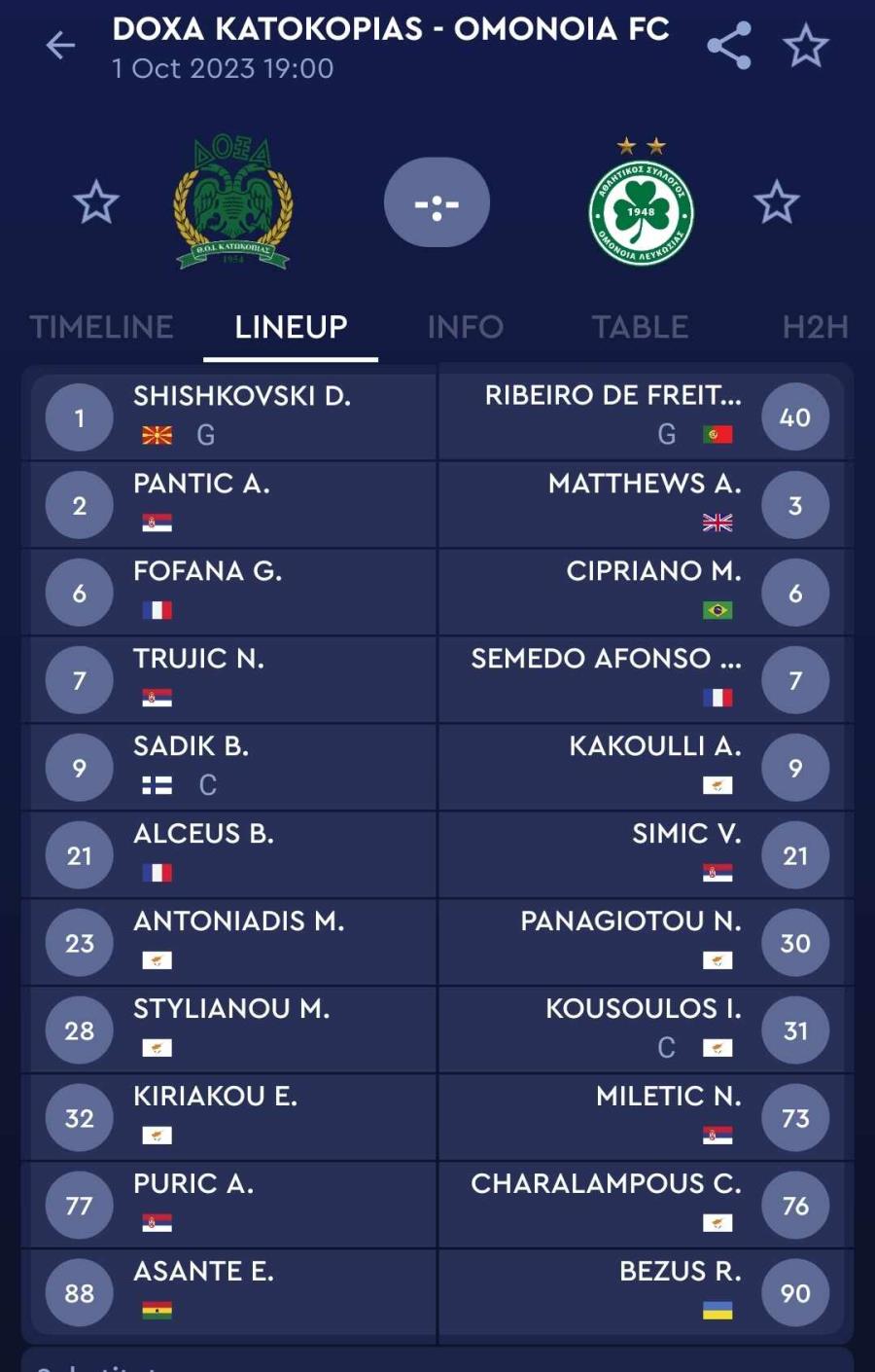 Φαμπιάνο, Μάθιους, Σιπριάνο, Παναγιώτου, Μίλετιτς, Κούσουλος, Χάμπος, Μπεζούς, Σεμέδο, Σίμιτς, Κακουλλής
