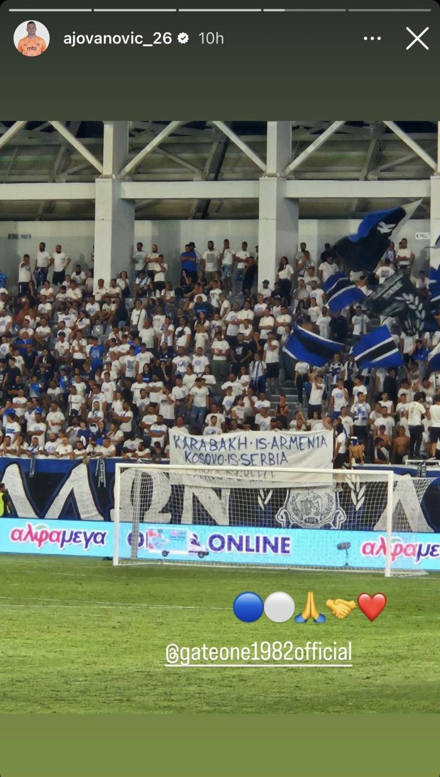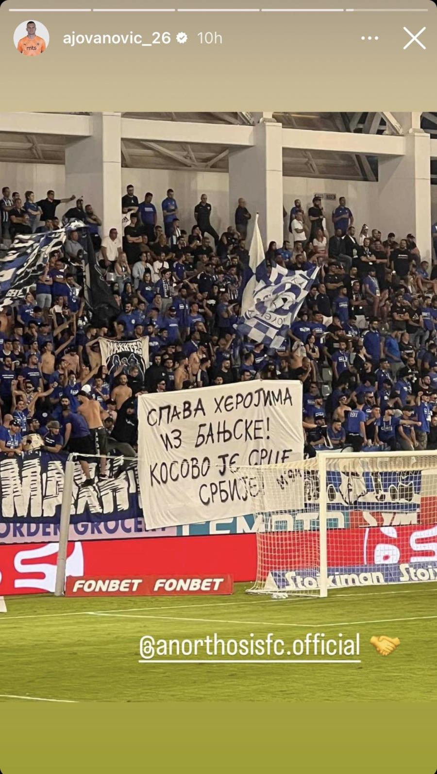Ο πρώην τερματοφύλακας του Απόλλωνα, Αλεξάνταρ Γιοβάνοβιτς, ανάρτησε φωτογραφίες με τα πανό που ανέβασαν φυγάδες και μαχητές στα ματς Άρης-Απόλλων και ΑΕΛ-Ανόρθωση, στα οποία αναγραφόταν το μήνυμα ότι το Κόσοβο είναι Σερβία.