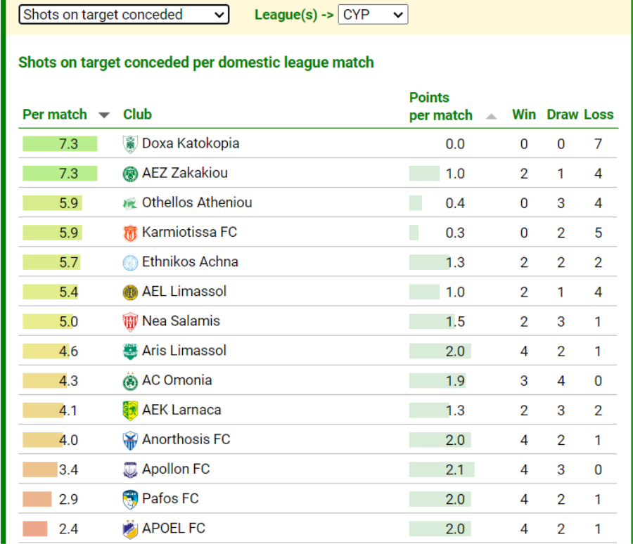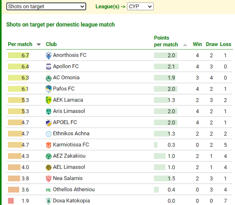 Η Κυρία είναι η ομάδα με τα περισσότερα εύστοχα σουτ στον αντίπαλο στόχο (shots on target), στη δεύτερη θέση είναι ο Απόλλωνας (6.4) και τρίτη η Ομόνοια (6.3) που διαθέτει την πρωτιά στα υπέρ της γκολ με 17.