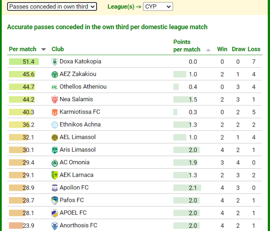 Η Ανόρθωση με 23.9 ανά παιχνίδι είναι στην πρώτη θέση της λίστας με τις ομάδες που γίνονται οι λιγότερες πάσες στο δικό τους τρίτο του γηπέδου.