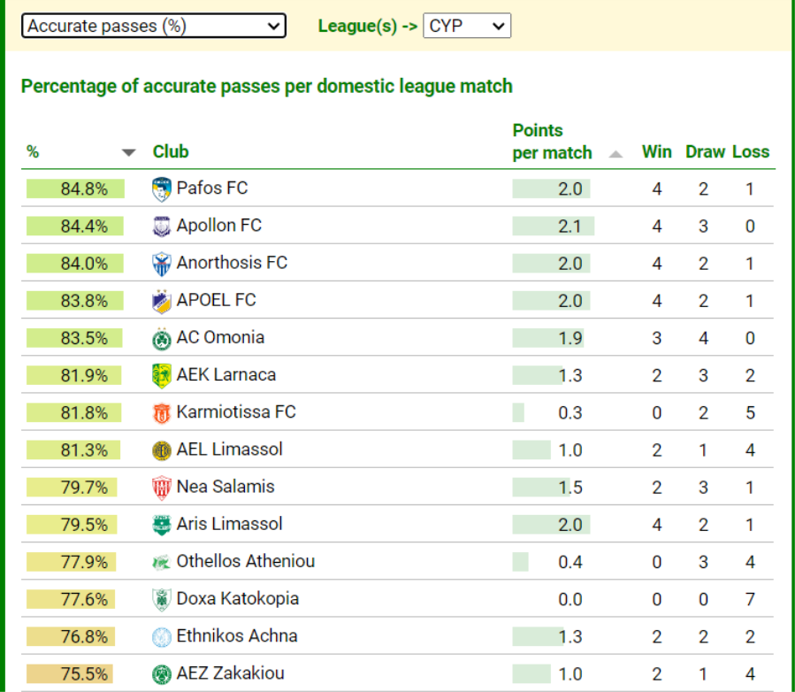 Το ψηλότερο ποσοστό στις ολοκληρωμένες πάσες συνολικά και στις ολοκληρωμένες πάσες στο αντίπαλο τρίτο καταγράφει η Πάφος, ενώ ο ΑΠΟΕΛ προηγείται στην κατηγορία με τα λιγότερα εύστοχα σουτ που έχουν πραγματοποιήσει οι αντίπαλοί του.
