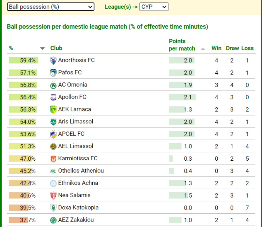 Η Ανόρθωση με ποσοστό 59.4% μέσο όρο ανά ματς είναι η ομάδα με την μεγαλύτερη διάρκεια κατοχής της μπάλας: