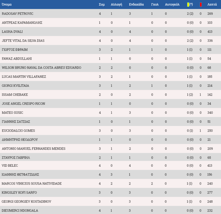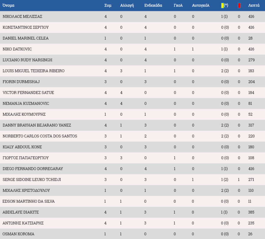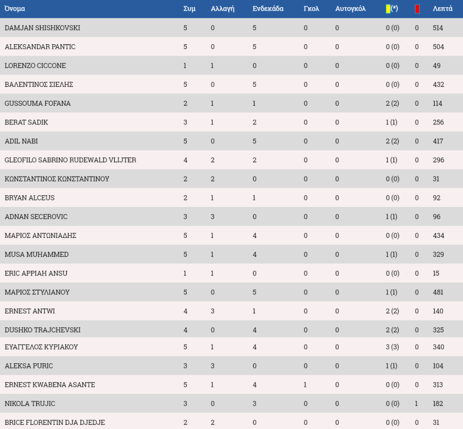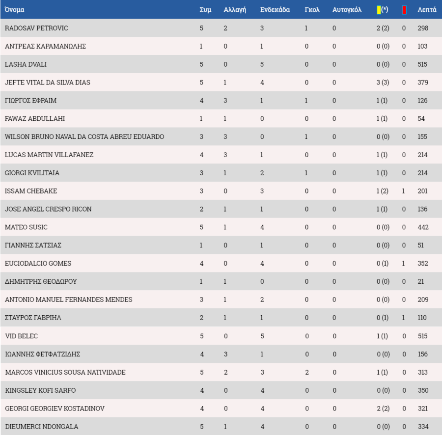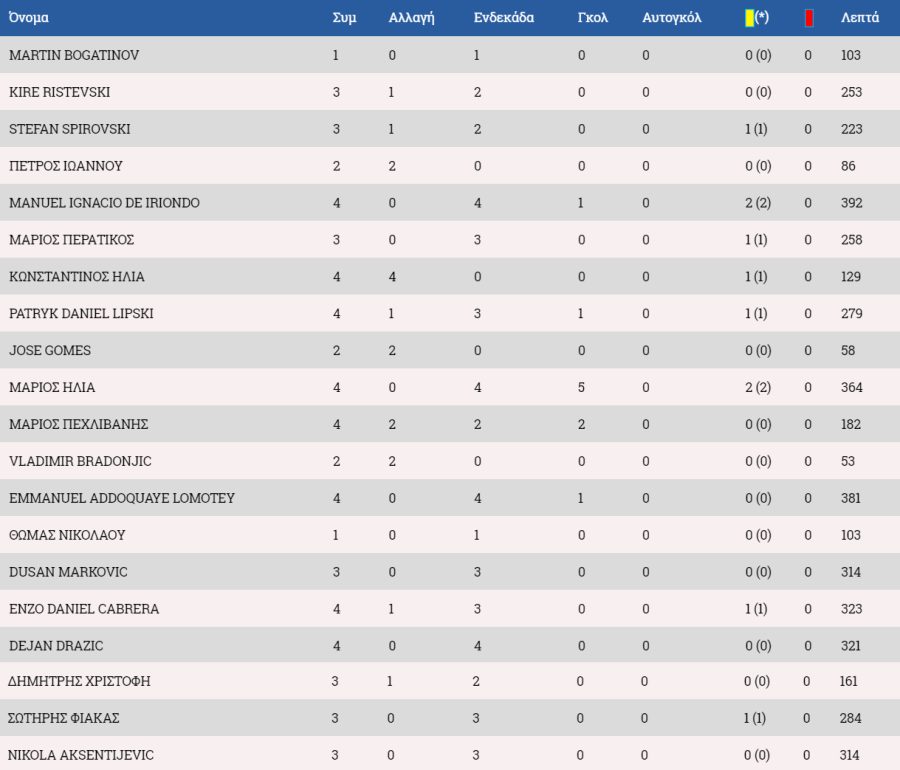 *6 αλλαγές σε σχέση με Οθέλλο (3η αγων.): Μπογκατίνοφ, Ριστέφσκι, Σπιρόφσκι, Νικολάου, Ηλία, Χριστοφή αντί Μάρκοβιτς,Λίπσκι, Πεχλιβάνη, Φιακά, Ακσεντίγεβιτς.