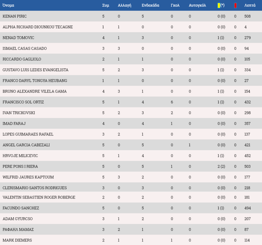 Στον πάγκο: Γιοσίποβιτς, Νταβό, Μιχαήλ, Βαλακάρι, Τουμάσι, Νταλίνια, Ταβάρες, Πελάζιο