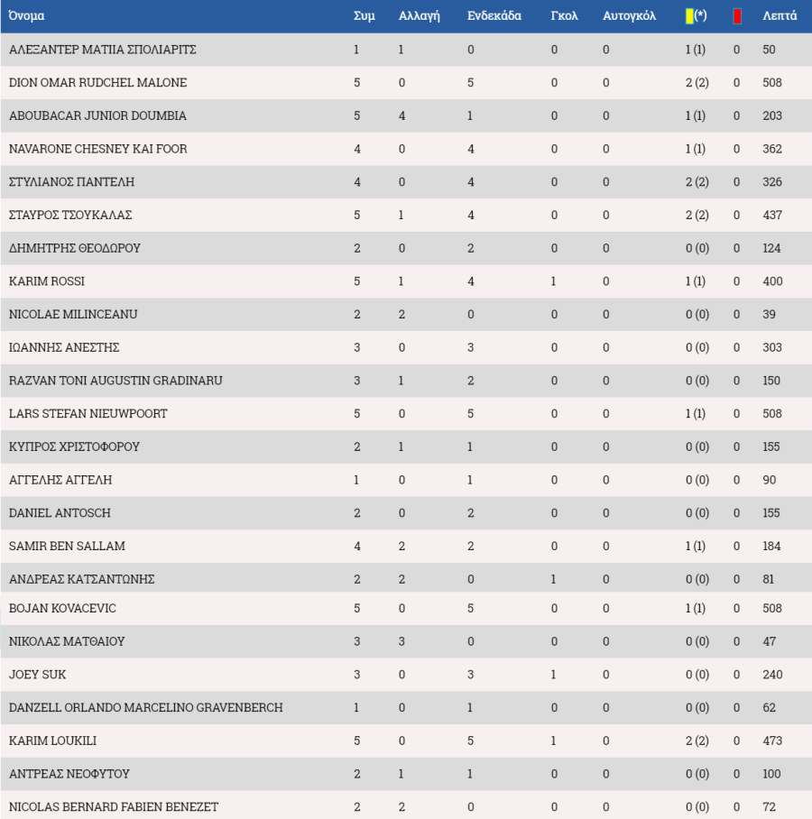 Κίτρινες: Κορίνους 10', Ναρντίνι 16', Γ.Χριστοδούλου 60'/Ντάτκοβιτς 39', Μ.Χριστοδούλου 85', Καρλίτος 86', Λέουκο 88'