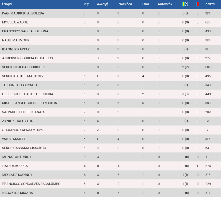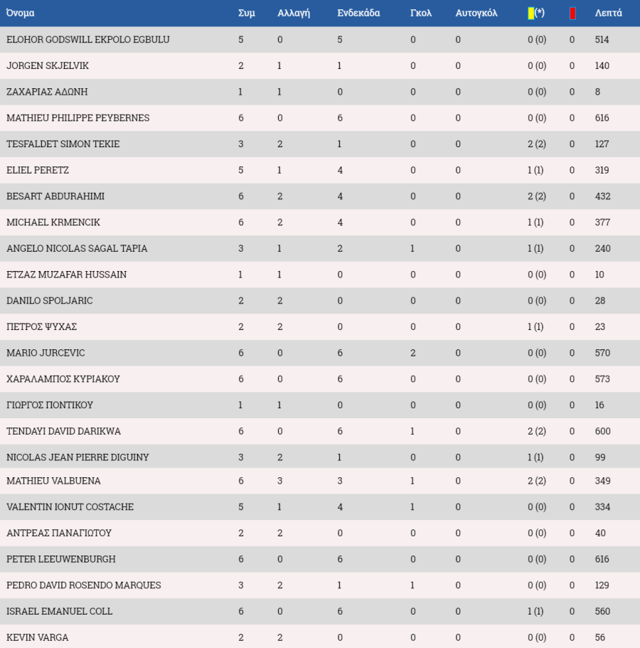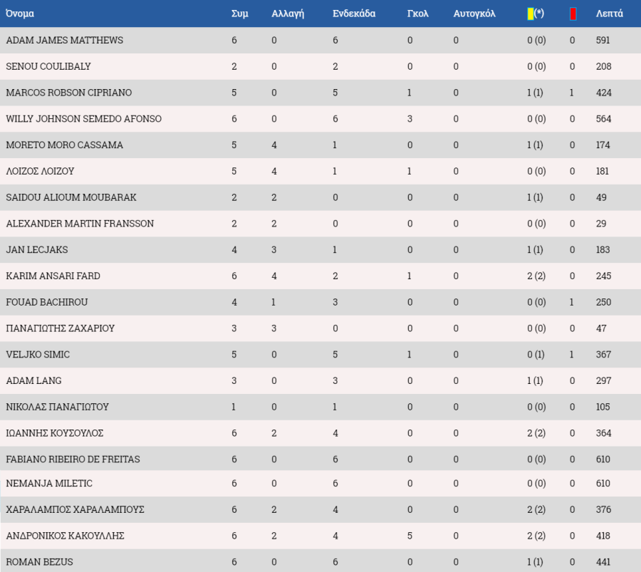 Στον πάγκο: Αντωνίου, Κυριάκου, Τραϊτσέφσκι, Ναμπί, Γκλεόφιλο, Γιαμπερέ, Σετσέροβιτς, Μούσα, Αντουί, Τζιέτζιε.