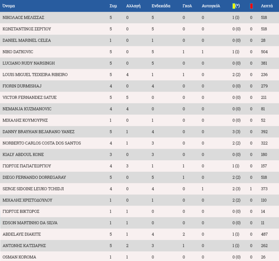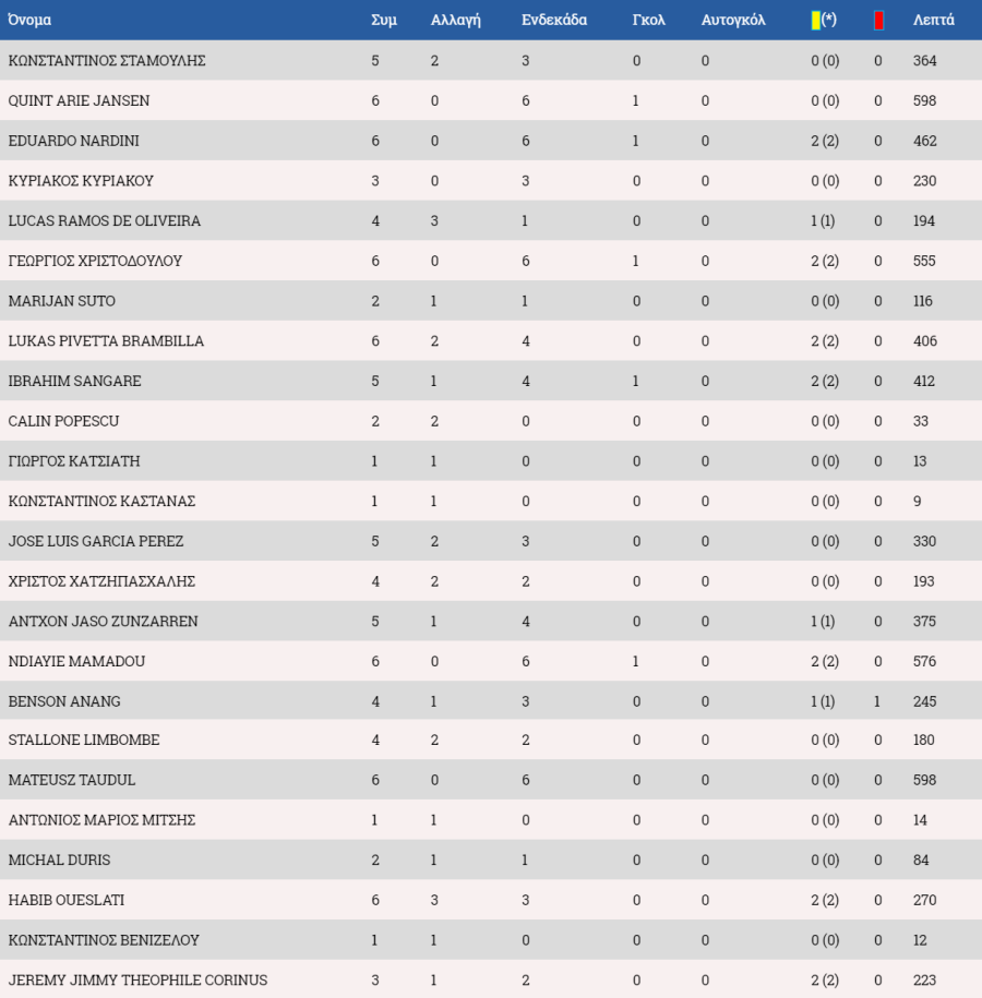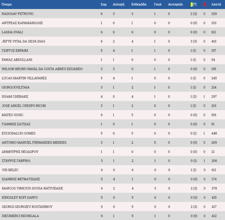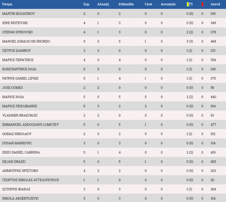 Στον πάγκο οι: Ολιβέιρα, Κυριάκου, Φραντζής, Σωτηρίου, Μπάστο, Παπαφώτης, Μπεραχίνο, Τσέρνιχ, Σιλβέστρος, Θεμιστοκλέους, Κολιάς, Κοντινέλα.