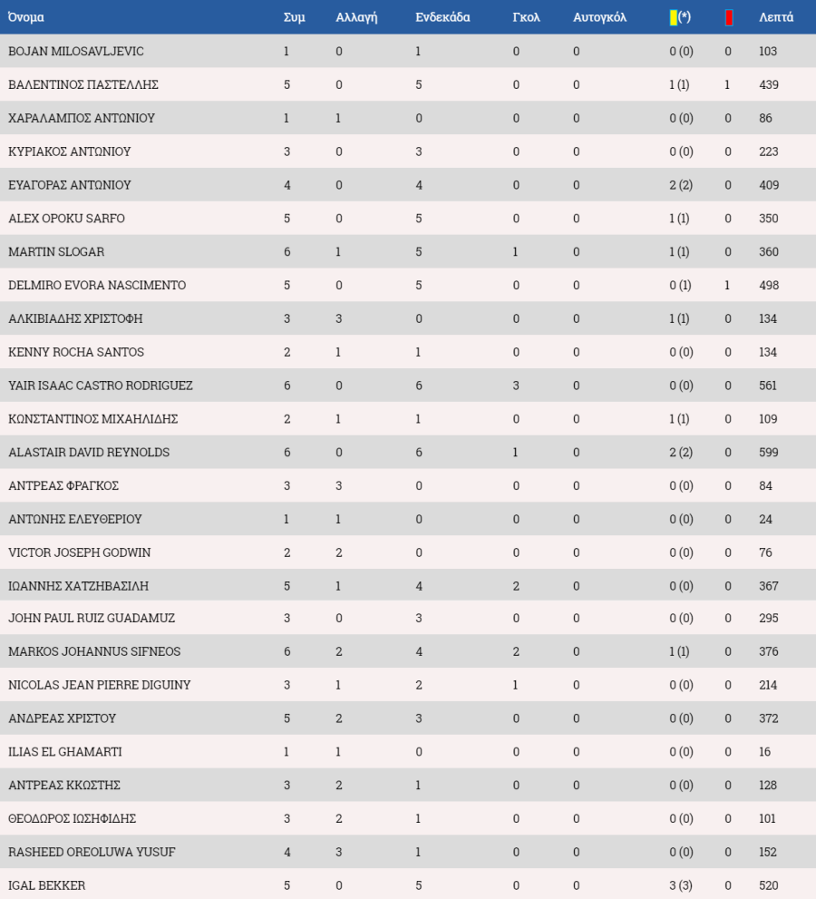 Κίτρινες: Μαρκίνιος 49' / Καμπρέρα 12', Σπιρόφσκι 26', Νικολάου 45', Ντε Ιριόντο 65', Ιωάννου 90'