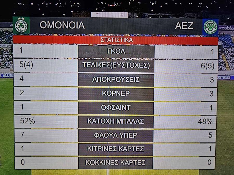 Η Ομόνοια βρήκε το γκολ της ισοφάρισης στο 18' με τον Κακουλλή να σκοράρει από το ύψος του πέναλτι με πλασέ ενώ οι παίκτες της ΑΕΖ διαμαρτυρήθηκαν για φάουλ του Καρίμ, με τον ρεφ και το VAR να επικυρώνουν κανονικά το γκολ.