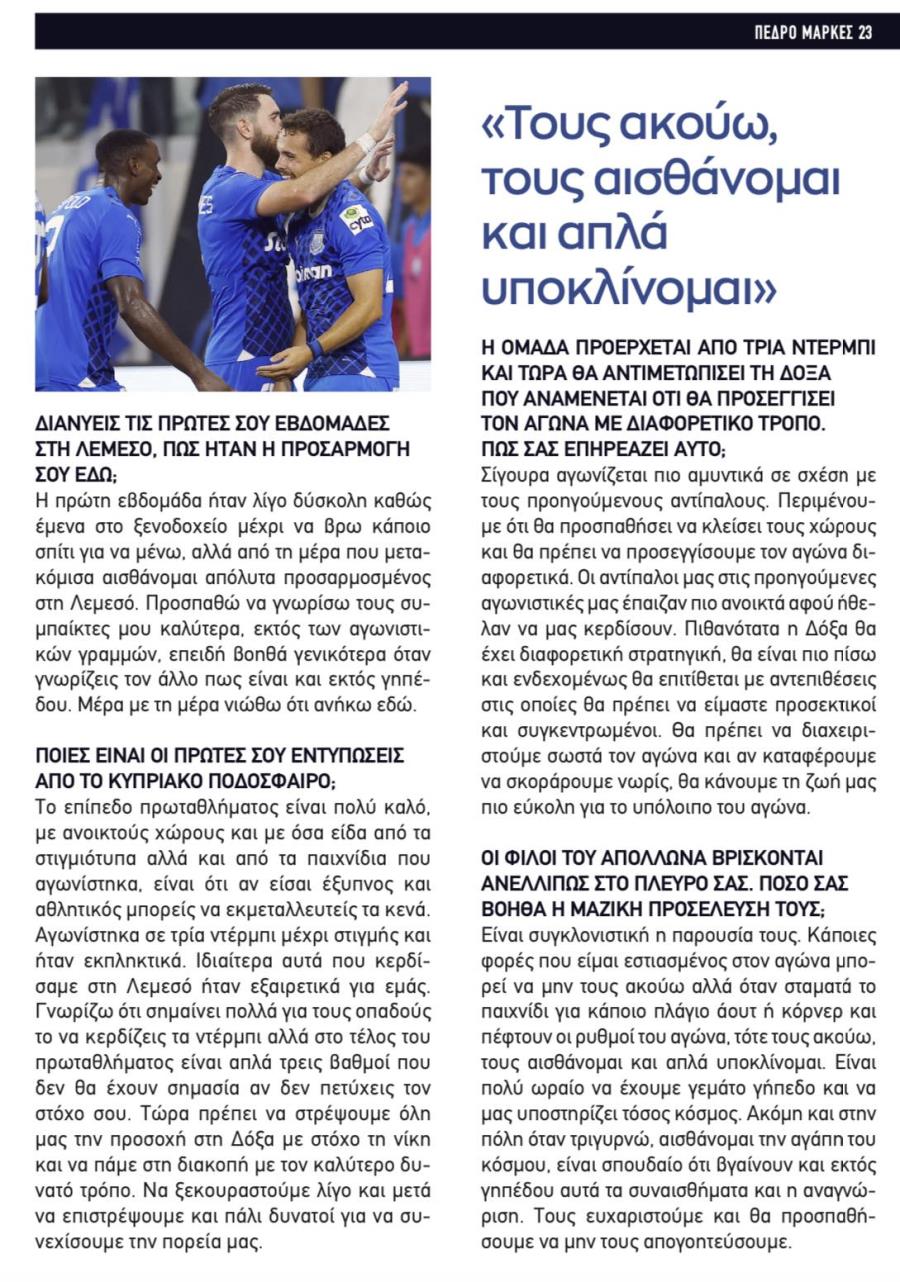 Ο ποδοσφαιριστής του Απόλλωνα, Πέδρο Μάρκες, μίλησε στο Match Program του αγώνα με τη Δόξα για τις πρώτες του εντυπώσεις από τη Λεμεσιανή ομάδα, τον κόσμο της, το Κυπριακό ποδόσφαιρο και όχι μόνο.