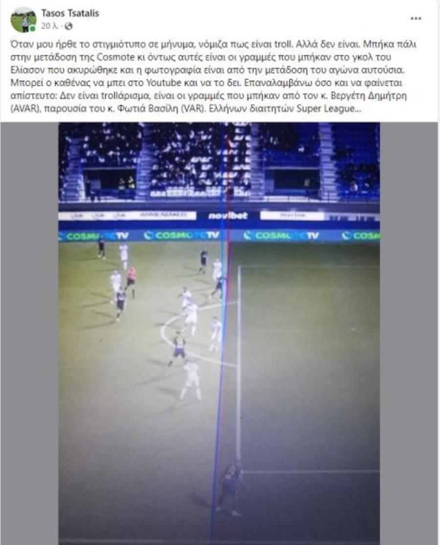 «Όταν μου ήρθε το στιγμιότυπο σε μήνυμα, νόμιζα πως είναι troll. Αλλά δεν είναι. Μπήκα πάλι στην μετάδοση της Cosmote κι όντως αυτές είναι οι γραμμές που μπήκαν στο γκολ του Ελίασον που ακυρώθηκε και η φωτογραφία είναι από την μετάδοση του αγώνα αυτούσια. Μπορεί ο καθένας να μπει στο Youtube και να το δει. Επαναλαμβάνω όσο και να φαίνεται απίστευτο: Δεν είναι trollάρισμα, είναι οι γραμμές που μπήκαν από τον κ. Βεργέτη Δημήτρη (AVAR), παρουσία του κ. Φωτιά Βασίλη (VAR). Ελλήνων διαιτητών Super League...».