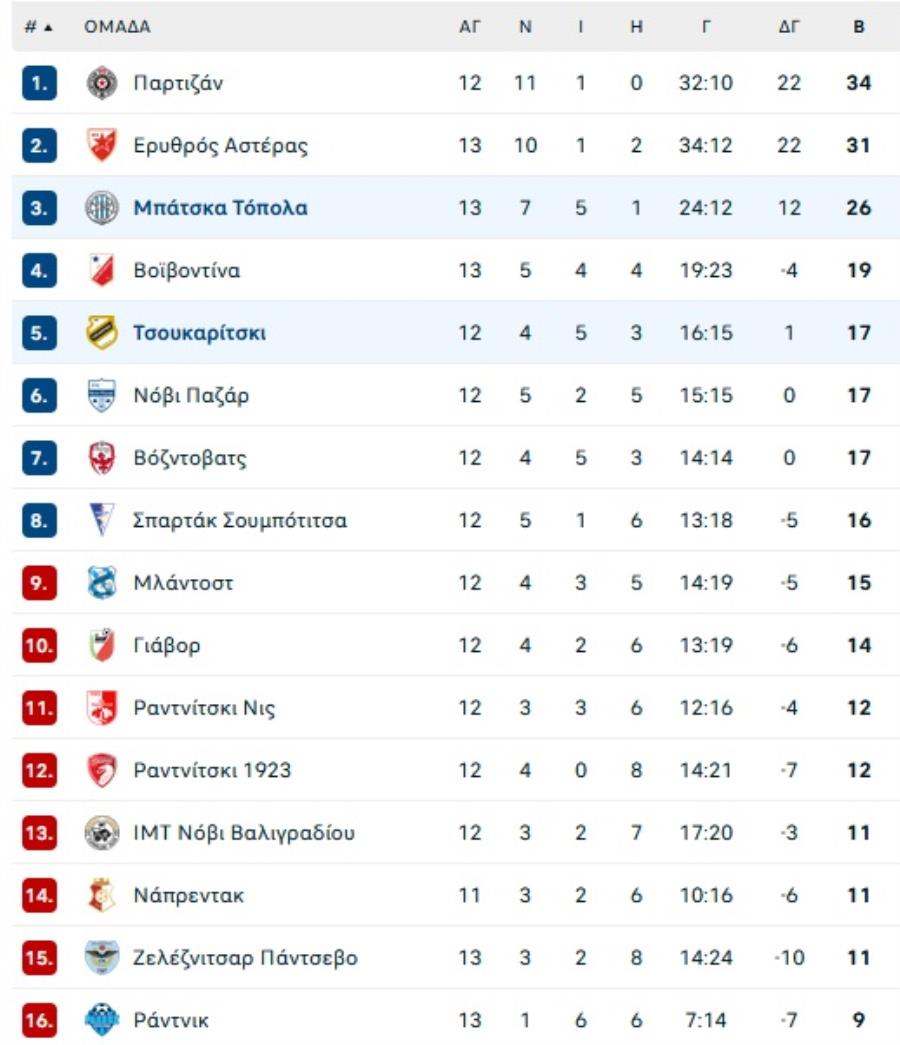 Η βαθμολογία στο πρωτάθλημα Σερβίας: