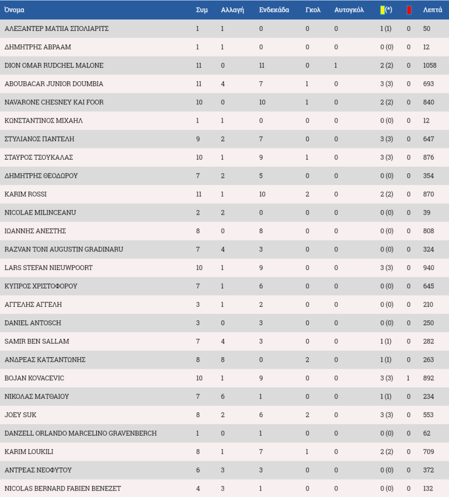 Ομόνοια: Φαμπιάνο (Ουζόχο 46'), Μάθιους, Κουλιμπαλί, Σιπριάνο (Λέζιακς 79'), Σεμέδο, Κακουλλής, Λοίζου (Αλιούμ 70'), Καρίμ, Μπασιρού (Ζαχαρίου 86'), Παναγιώτου, Χαραλάμπους (Φράνσον 70').