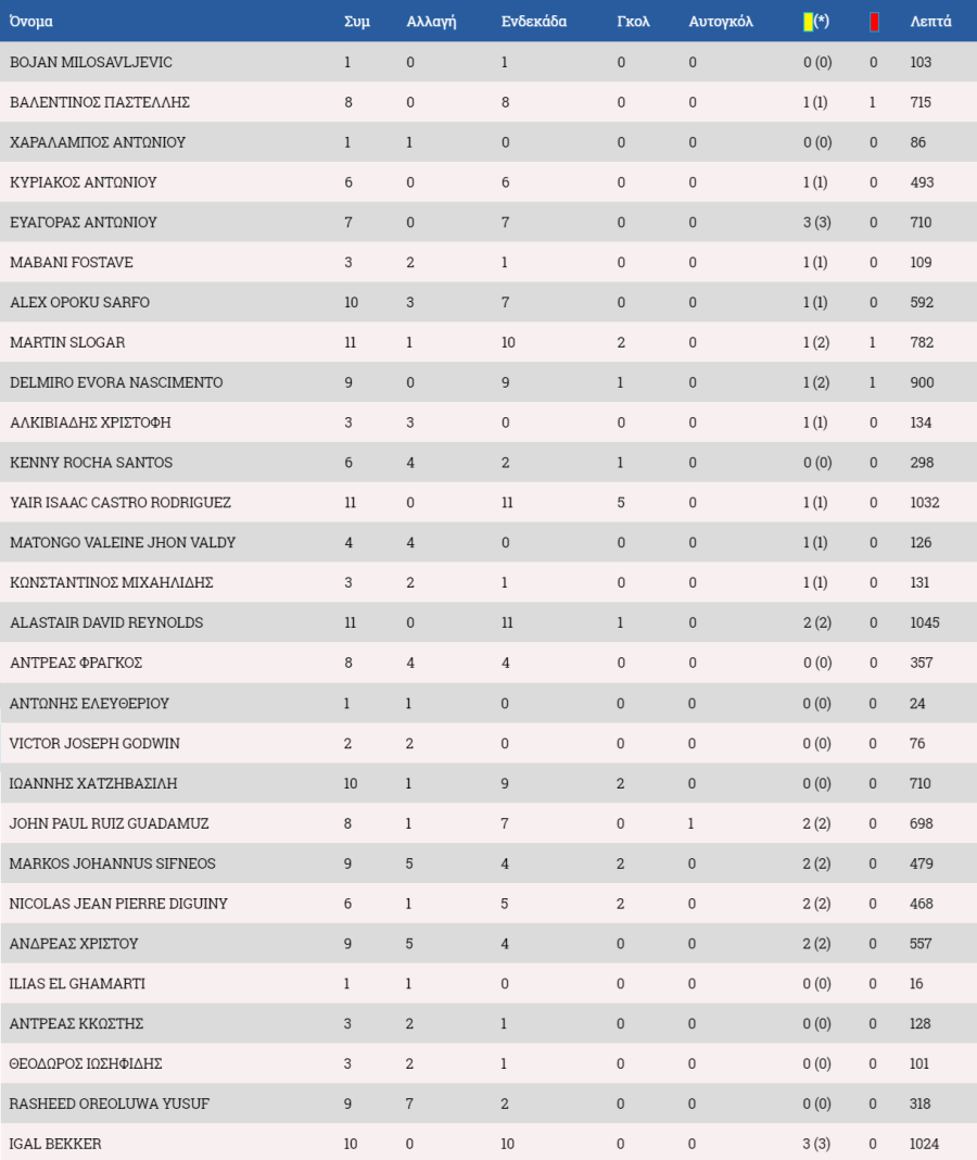 Στον πάγκο: Μιχαήλ, Κεραυνός, Χαραλάμπους, Αντωνίου, Κίκο, Κορρέα, Τζούλιου.