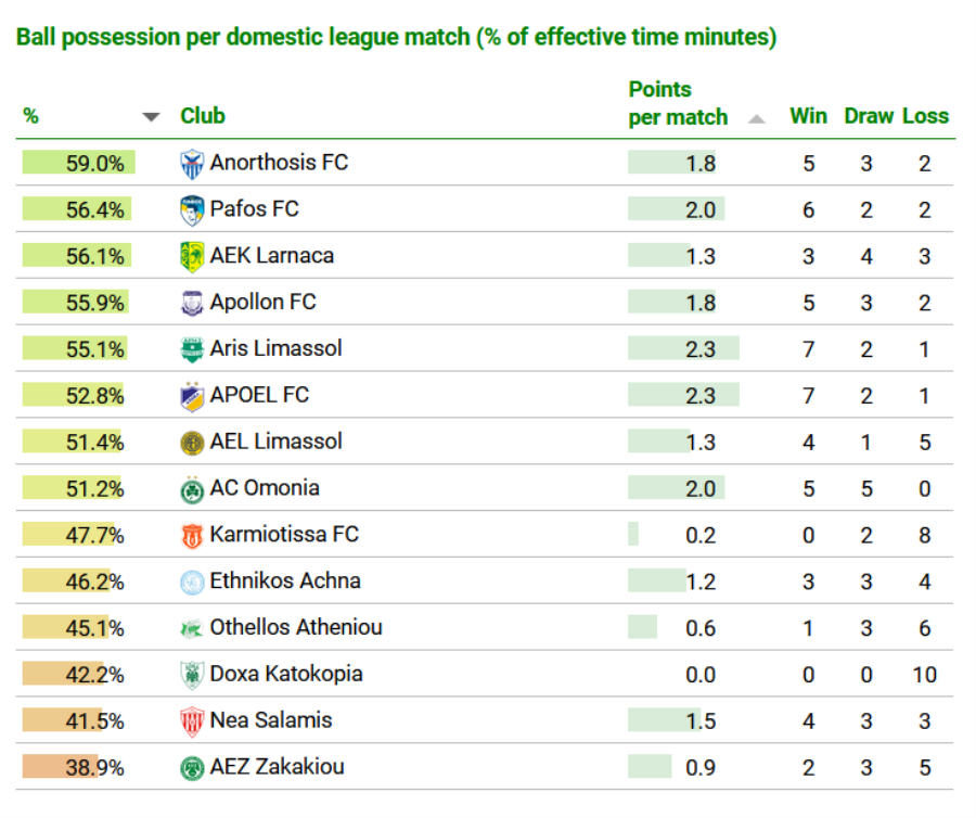 Μετά την ομάδα του Γκαγέγο (59%) ακολουθεί η Πάφος (56.4%) του Καρσέδο (56.1%) και η ΑΕΚ του Όλτρα. Στην πρώτη τριάδα ξεχωρίζει το... αποτύπωμα των Ισπανών προπονητών.