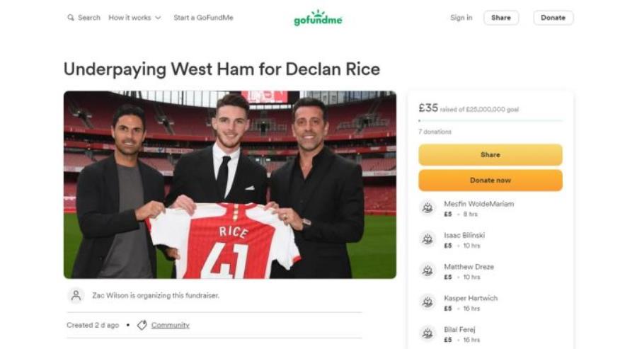 Οι φίλοι της Άρσεναλ είναι ξετρελαμένοι με τη μεταγραφή του Ντέκλαν Ράις σε τέτοιο βαθμό που ένας εξ αυτών διενεργεί έρανο για να δώσουν περισσότερα χρήματα στη Γουέστ Χαμ.