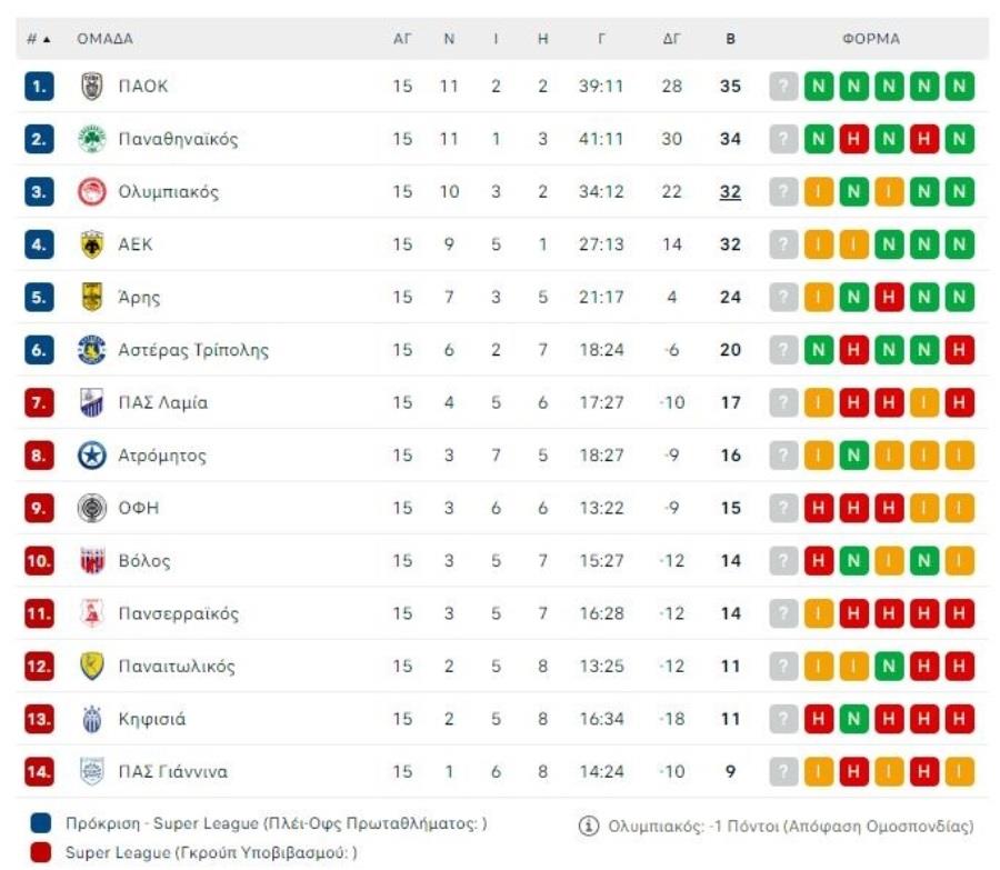 Αναλυτικά η βαθμολογία του πρωταθλήματος