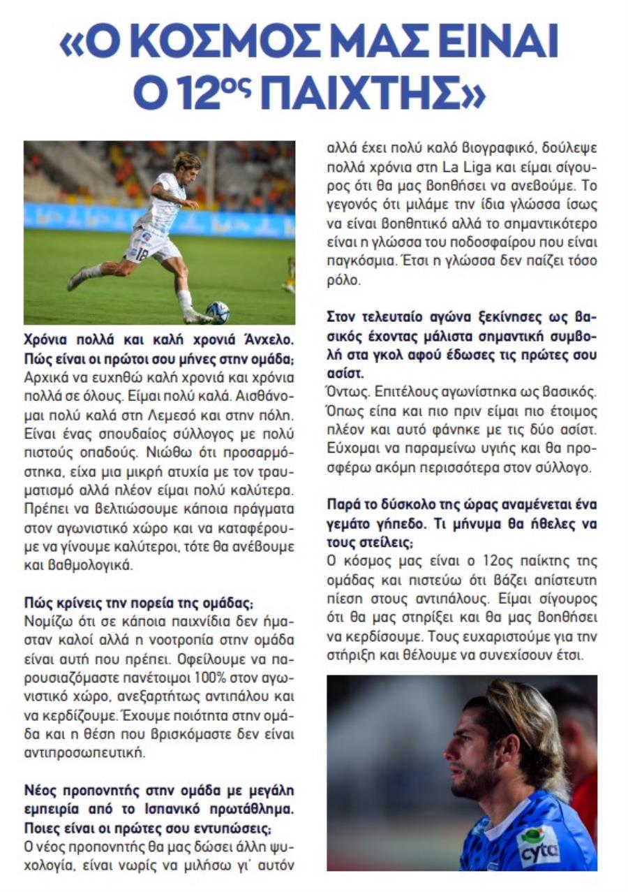 Αρχικά να ευχηθώ καλή χρονιά και χρόνια πολλά σε όλους. Είμαι πολύ καλά. Αισθάνομαι πολύ καλά στη Λεμεσό και στην πόλη. Είναι ένας σπουδαίος σύλλογος με πολύ πιστούς οπαδούς. Νιώθω ότι προσαρμόστηκα, είχα μια μικρή ατυχία με τον τραυματισμό αλλά πλέον είμαι πολύ καλύτερα. Πρέπει να βελτιώσουμε κάποια πράγματα στον αγωνιστικό χώρο και να καταφέρουμε να γίνουμε καλύτεροι, τότε θα ανέβουμε και βαθμολογικά.