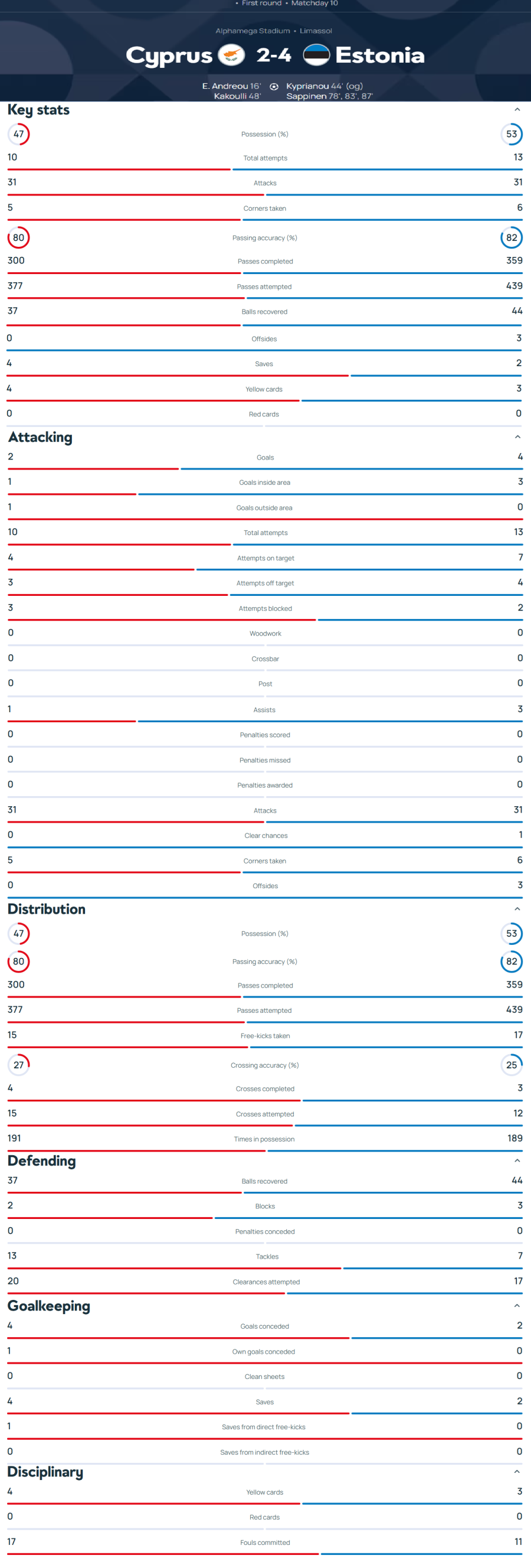 ΚΥΠΡΟΣ-ΕΣΘΟΝΙΑ 2-4 (Αντρέου 16', Κακουλλής 49'/ Κυπριανού 44' αυτ., Sappinen 78', 83' 87') (18/11/2025) ΦΙΛΙΚΟ