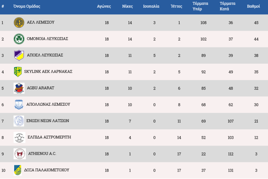 Στην κορυφή με 39 η ΑΕΛ, στους 38 η Ομόνοια και 3ο το ΑΠΟΕΛ με 35.