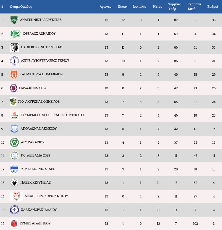 Η βαθμολογία του πρωταθλήματος ΕΔΩ.