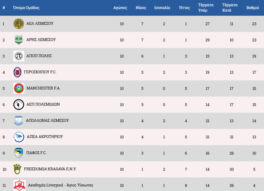 Η βαθμολογία του πρωταθλήματος ΕΔΩ.