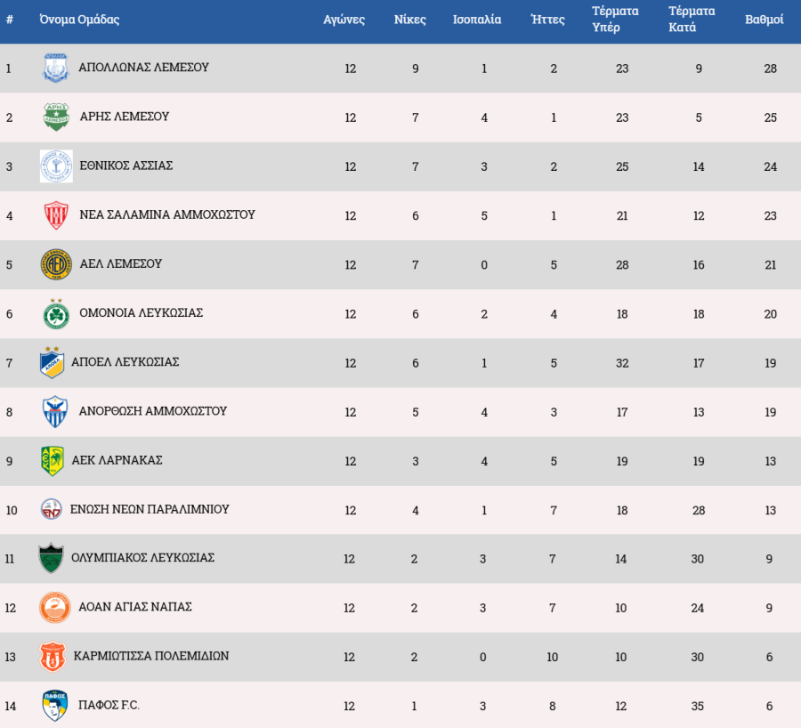 *Στην βαθμολογία 1. ΑΠΟΕΛ 13 2. Άρης 12 (με αγώνα λιγότερο) 3.Απόλλωνας 12 4. Εθνικός Άσσιας 11.