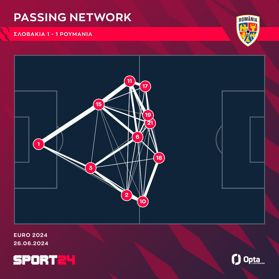 Όπως φαίνεται από το passing network ο Μάριν (με το νούμερο 18) ήταν ο πιο προωθημένος της ομάδας του, ανεβαίνοντας ψηλά για να πιέσει την άμυνα των Σλοβάκων, αλλά και για να συνεργαστεί με τους συμπαίκτες του.