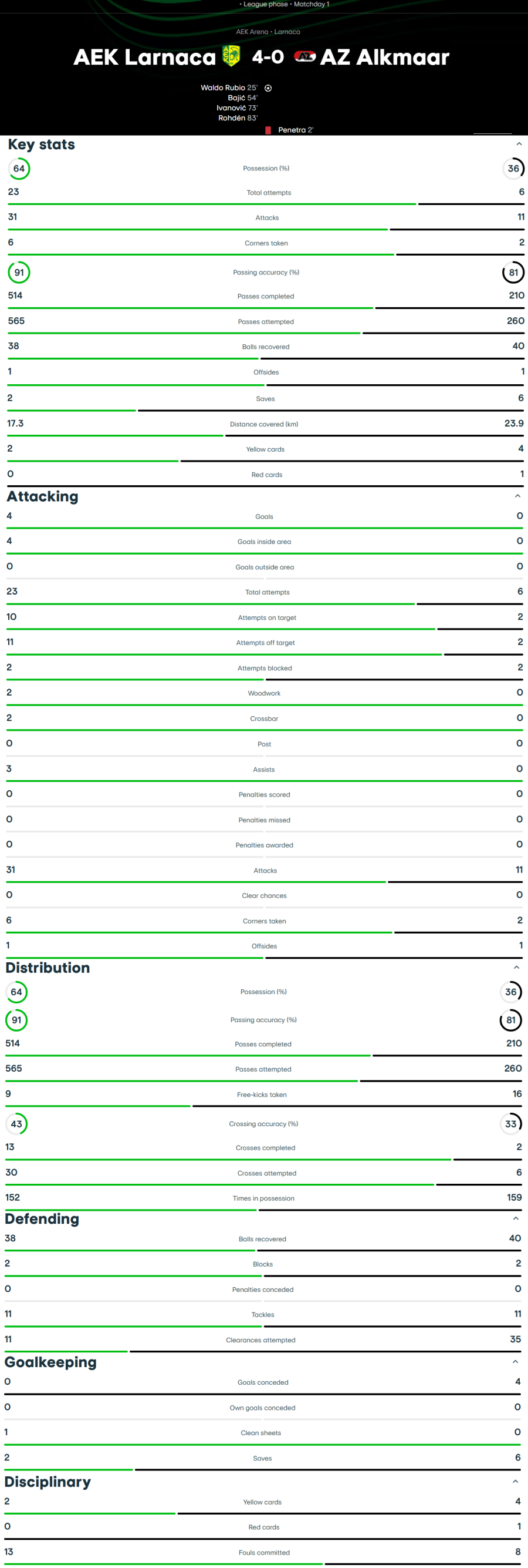- ΛΕΓΚΙΑ-ΑΕΚ 2-1 (Nsame 11', Rajovic 16'/Ιβάνοβιτς 52') (14/08/2025), Γ' γύρος Γιουρόπα Λιγκ, 2ος αγώνας ΛΕΓΚΙΑ: Tobiasz, Kapuadi, Wszołek, Augustyniak, Nsame, Rúben Vinagre(Reca 79'), Bichakhchyan (Stojanović 71'), Ziółkowski, Morishita (Urbański 71'), Rajovic (Alfarela 61'), Jędrzejczyk (Shkurin 79') Στον πάγκο: Kobylak (GK), Banasik (GK), Burch, Pankov, Żewłakow, Elitim, Kun ΑΕΚ: Αλομέροβιτς, Εκπολό, Ρομπέρζ, Γκαρθία (Ενρίκες 90'), Γκνάλι, Μιλίσεβιτς, Λέδες, Πονς, Ιβάνιβιτς (Σουάρες 86'), Τσακόν (Μιραμόν 86'), Ανγιέλσκι (Καμπρέρα 71') Στον πάγκο: Παρασκευάς, Δημητρίου, Ιωάννου, Μπάγιτς, Αμίν, Λουκαϊδης, Γερασίμου, Γκονζάλες Κίτρινες: Jędrzejczyk 1', Vinagre 38', Tobiasz 78', Augustyniak 79' / Ρομπέρζ 45', Νάλι 63', Μιλίτσεβιτς 68', Τσακόν 79' Κόκκινη: Νάλι 72' (Δευτ. Κίτρινη) Διαιτητής: Andris Treimanis LVA Βοηθός: Haralds Gudermanis LVA Βοηθός: Aleksejs Spasennikovs LVA Τέταρτος: Aleksandrs Golubevs LVA VAR: Kristaps Ratnieks LVA VAR: Vitālijs Spasjoņņikovs LVA *23.673 εισιτήρια *Καμία αλλαγή σε σχέση με τον πρώτο αγώνα. *Κίτρινη στον Edward Marius Iordanescu, προπονητή της Λέγκια. *Κίτρινη στον Ιμανόλ Ιδιάκεθ στο 89' *ΑΚΥΡΩΘΗΚΕ γκολ Ανγκιέλσκι στο 44', μέσω VAR. https://www.uefa.com/uefaeuropaleague/match/2045742--legia-warszawa-vs-aek-larnaca/ https://int.soccerway.com/matches/2025/08/14/europe/uefa-cup/legia/aek-larnaca/I2170119/ LEGIA - AEK 2-1 (agg. 3-5) 3ος Προκριματικός Γύρος Europa League 14.08.2025
