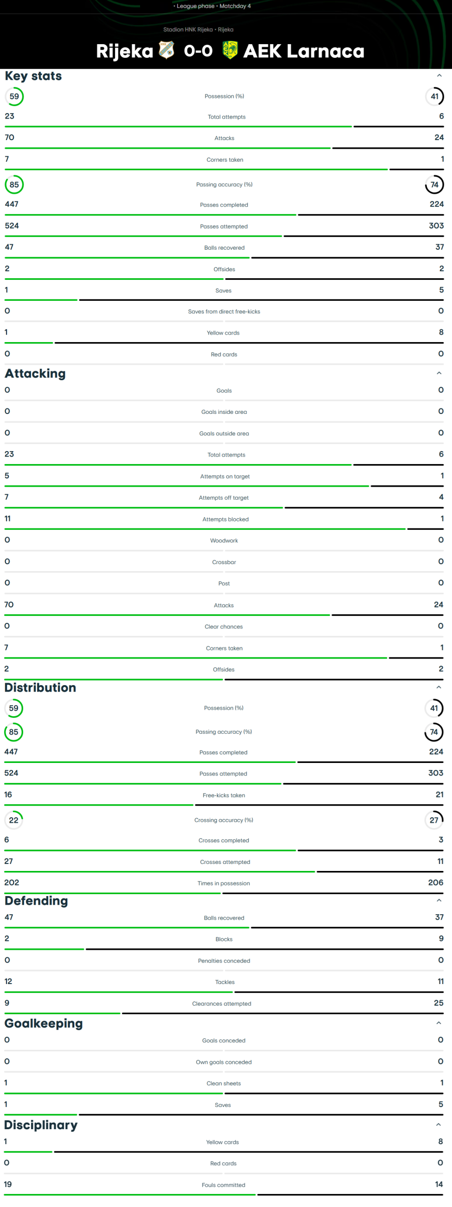 4η αγων.(27/11):Ριέκα-ΑΕΚ 0-0 , Conference League Ριέκα: Zlomislic, Orec, Majstorovic, Husic, Radeljic, Lasickas, Vignato, Dantas, Fruk, Gojak (Cop 67'), Adu-Adjei(Menalo 67') . Στον πάγκο: Todorovic, Kitin, Petrovic, Rukavina, Devetak, Ndockyt, Thaqi, Butic, Juric, Bodetic. ΑΕΚ: Αλομέροβιτς, Μιραμόν, Μιλίσεβιτς, Σαμπορίτ, Γκνάλι, Πονς(Γκονζάλες 90'), Λέδες, Ρούμπιο (Εκπολό 74'), Ναούμ (Σουάρεθ 74'), Ιβάνοβιτς (Ρομπέρζ 90'), Μπάγιτς(Καμπρέρα 74'). Στον πάγκο: Παρασκευάς, Δημητρίου, Ιωάννου, Γκαρσία, Ανγκιέλσκι, Ρομπέρζ, Γερασίμου Κίτρινες: Majstorovic 90'+6'/Ρούμπιο 13', Ναλί 45', Ναούμ 56', Μιραμόν 60', Πονς 60', Σαμπορίτ 90', Μιλίτσεβιτς 90' Διαιτητής: Ρομπ Χένεσι (Ιρλανδία) Α’ Βοηθός: Ντέρμοτ Μπρόουτον (Ιρλανδία) Β’ Βοηθός: Έμετ Ντάιναν (Ιρλανδία) 4ος: Πολ ΜακΛάφλιν (Ιρλανδία) VAR: Ρίτσαρντ Μάρτενς (Ολλανδία) AVAR: Γέρον Μάνσχοτ (Ολλανδία *1 αλλαγή σε σχέση με Ολυμπιακό: Ναλί αντί Χάιρο. *ΑΚΥΡΩΘΗΚΕ γκολ ΑΕΚ μέσω VAR στο 51. *Κίτρινη στον βοηθό και αδερφό του Ιμανόλ Ιδιάκεθ, Ινίγκο Ιδιάκεθ.. https://www.soccerway.com/match/aek-larnaca-4lUZQCQq/rijeka-zXKuUR5J/?mid=bXDhHmBM https://www.uefa.com/uefaconferenceleague/match/2046362--rijeka-vs-aek-larnaca/ https://www.youtube.com/watch?v=WXBDVv1gf-Q