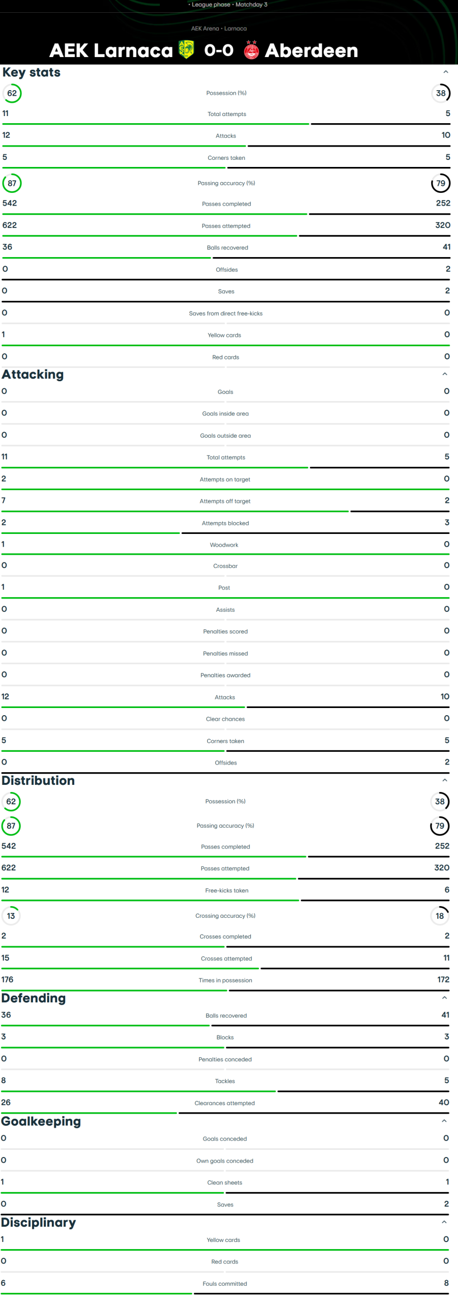 3η αγων. (06/11): ΑΕΚ-Αμπερντίν 0-0 , ECL League Phase ΑΕΚ: Αλομέροβιτς, Μιραμόν, Εκπολό (90+3' Ιωάννου), Μιλίσεβιτς, Νάλι, Σουάρεθ, Πονς (72' Γκονζάλες), Ιβάνοβιτς, Ρούμπιο (67' Ναούμ), Μπάγιτς (72' Ανγκιέλσκι), Λέδες. Στον πάγκο: Παρασκευάς, Δημητρίου, Λέδες, Ανγκιέλσκι, Ρομπέρζ, Ναούμ, Γερασίμου, Γκονζάλες. ABERDEEN: Mitov, Devlin, Knoester, Aouchiche, Polvara (84' Shinnie), Armstrong (63' Keskinen), Karlsson (75' Milanovic), Milne, Lazetić (63' Nisbet), Jensen (75' Gyamfi), Lobban Στον πάγκο: Suman, Vitols, Shinnie, Yengi, Clarkson, Milanovic, Nisbet, Molloy, Gyamfi, Keskinen Κίτρινες: Γκονζάλες 90' Διαιτητής: Dalibor Černý Βοηθοί διαιτητές:Jan Paták - Kamil Hajek Τέταρτος διαιτητής: Jan Petrik VAR:Tomas Kocourek AVAR: Miroslav Zelinka *4 αλλαγές σε σχέση με Απόλλωνα. Νάλι, Σουάρεθ, Μιραμόν, Μιλίσεβιτς αντί Σαμπορίτ, Ιωάννου, Χάιρο, Ρόντεν. https://www.soccerway.com/match/aberdeen-AmdbMiWq/aek-larnaca-4lUZQCQq/?mid=b5krOeO6 https://www.uefa.com/uefaconferenceleague/match/2046347--aek-larnaca-vs-aberdeen/ AEK 0-0 Aberdeen 06.11.2025 https://www.youtube.com/watch?v=eWCTeSgiQQo