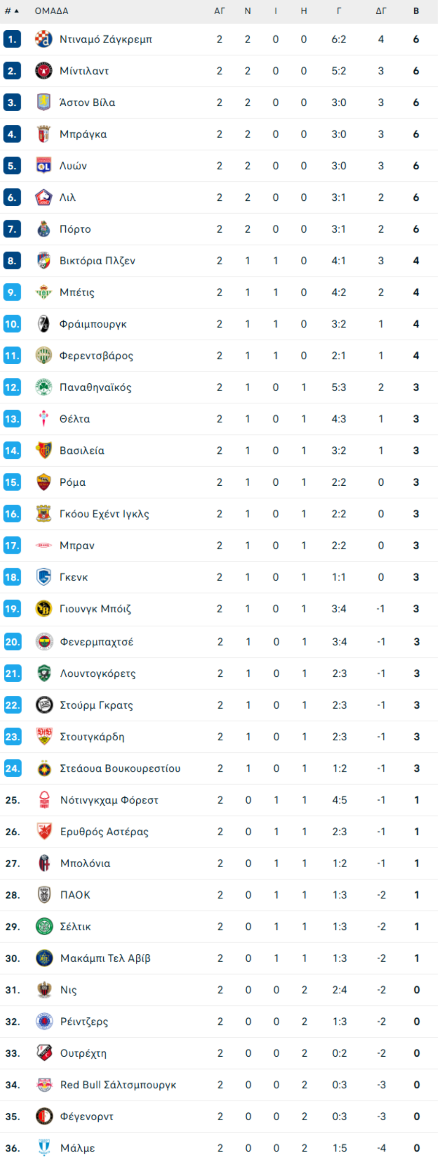 VIDEO Λιόν – Ζάλτσμπουργκ 2-0 - - -3η αγωνιστική: 23.10. 19:45 Γκενκ-Μπέτις Γκόου Εχέντ Ιγκλς-Άστον Βίλα Λυών-Βασιλεία Μπράγκα-Ερυθρός Αστέρας Μπραν-Ρέιντζερς Red Bull Σάλτσμπουργκ-Φερεντσβάρος Στεάουα Βουκουρεστίου-Μπολόνια Φέγενορντ-Παναθηναϊκός Φενερμπαχτσέ-Στουτγκάρδη 23.10. 22:00 Γιουνγκ Μπόιζ-Λουντογκόρετς Θέλτα-Νις Λιλ-ΠΑΟΚ Μάλμε-Ντιναμό Ζάγκρεμπ Μακάμπι Τελ Αβίβ-Μίντιλαντ Νότινγκχαμ Φόρεστ-Πόρτο Ρόμα-Βικτόρια Πλζεν Σέλτικ-Στούρμ Γκρατς Φράιμπουργκ-Ουτρέχτη - -4η αγωνιστική: 06.11. 19:45 Βασιλεία=Στεάουα Βουκουρεστίου Ερυθρός Αστέρας-Λιλ Μάλμε-Παναθηναϊκός Μίντιλαντ-Σέλτικ Νις-Φράιμπουργκ Ντιναμό Ζάγκρεμπ-Θέλτα Ουτρέχτη-Πόρτο Red Bull Σάλτσμπουργκ-Γκόου Εχέντ Ιγκλς Στούρμ Γκρατς-Νότινγκχαμ Φόρεστ 06.11. 22:00 Άστον Βίλα-Μακάμπι Τελ Αβίβ Βικτόρια Πλζεν-Φενερμπαχτσέ Μπέτις-Λυών Μπολόνια-Μπραν Μπράγκα-Γκενκ ΠΑΟΚ-Γιουνγκ Μπόιζ Ρέιντζερς-Ρόμα Στουτγκάρδη-Φέγενορντ Φερεντσβάρος-Λουντογκόρετς - -5η αγωνιστική: 27.11. 19:45 Άστον Βίλα-Γιουνγκ Μπόιζ Βικτόρια Πλζεν-Φράιμπουργκ Λιλ-Ντιναμό Ζάγκρεμπ Λουντογκόρετς-Θέλτα ΠΑΟΚ-Μπραν Πόρτο-Νις Ρόμα-Μίντιλαντ Φέγενορντ-Σέλτικ Φενερμπαχτσέ-Φερεντσβάρος 27.11. 22:00 Γκενκ-Βασιλεία Γκόου Εχέντ Ιγκλς-Στουτγκάρδη Ερυθρός Αστέρας-Στεάουα Βουκουρεστίου Μακάμπι Τελ Αβίβ-Λυών Μπέτις-Ουτρέχτη Μπολόνια-Red Bull Σάλτσμπουργκ Νότινγκχαμ Φόρεστ-Μάλμε Παναθηναϊκός-Στούρμ Γκρατς Ρέιντζερς-Μπράγκα - -6η αγωνιστική: 11.12. 19:45 Γιουνγκ Μπόιζ-Λιλ Λουντογκόρετς-ΠΑΟΚ Μίντιλαντ-Γκενκ Νις-Μπράγκα Ντιναμό Ζάγκρεμπ-Μπέτις Ουτρέχτη-Νότινγκχαμ Φόρεστ Στουτγκάρδη-Μακάμπι Τελ Αβίβ Στούρμ Γκρατς-Ερυθρός Αστέρας Φερεντσβάρος-Ρέιντζερς 11.12. 22:00 Βασιλεία-Άστον Βίλα Θέλτα-Μπολόνια Λυών-Γκόου Εχέντ Ιγκλς Μπραν-Φενερμπαχτσέ Παναθηναϊκός=Βικτόρια Πλζεν Πόρτο-Μάλμε Σέλτικ-Ρόμα Στεάουα Βουκουρεστίου-Φέγενορντ Φράιμπουργκ-Red Bull Σάλτσμπουργκ - -7η αγωνιστική: 22.01. 19:45 Βικτόρια Πλζεν-Πόρτο Γιουνγκ Μπόιζ-Λυών Μάλμε-Ερυθρός Αστέρας Μπολόνια-Σέλτικ Μπραν-Μίντιλαντ ΠΑΟΚ-Μπέτις Φέγενορντ-Στούρμ Γκρατς Φενερμπαχτσέ-Άστον Βίλα Φράιμπουργκ-Μακάμπι Τελ Αβίβ 22.01. 22:00 Θέλτα-Λιλ Μπράγκα-Νότινγκχαμ Φόρεστ Νις-Γκόου Εχέντ Ιγκλς Ντιναμό Ζάγκρεμπ-Στεάουα Βουκουρεστίου Ουτρέχτη-Γκενκ Ρέιντζερς-Λουντογκόρετς Ρόμα-Στουτγκάρδη Red Bull Σάλτσμπουργκ-Βασιλεία Φερεντσβάρος-Παναθηναϊκός - -8η αγωνιστική: 29.01. 22:00 Άστον Βίλα-Red Bull Σάλτσμπουργκ Βασιλεία-Βικτόρια Πλζεν Γκενκ-Μάλμε Γκόου Εχέντ Ιγκλς-Μπράγκα Ερυθρός Αστέρας-Θέλτα Λιλ-Φράιμπουργκ Λουντογκόρετς-Νις Λυών-ΠΑΟΚ Μακάμπι Τελ Αβίβ-Μπολόνια Μίντιλαντ-Ντιναμό Ζάγκρεμπ Μπέτις-Φέγενορντ Νότινγκχαμ Φόρεστ-Φερεντσβάρος Παναθηναϊκός-Ρόμα Πόρτο-Ρέιντζερς Σέλτικ-Ουτρέχτη Στεάουα Βουκουρεστίου-Φενερμπαχτσέ Στουτγκάρδη-Γιουνγκ Μπόιζ Στούρμ Γκρατς-Μπραν - -