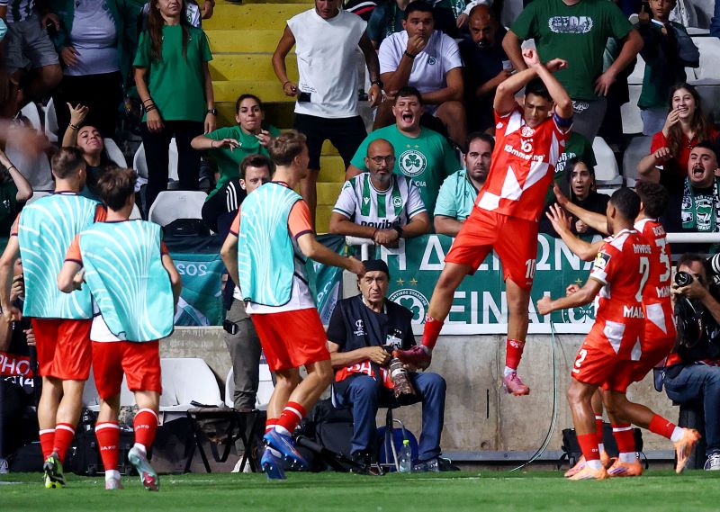 Ο αρχηγός της Μάιντζ Αμιρί, μετά το άνοιγμα του σκορ από τα 11 βήματα, πήγε σε ένα σημείο κοντά στο πέταλο που ήταν οι Ομονοιάτες, πανηγυρίζοντας με τους συμπαίχτες του…