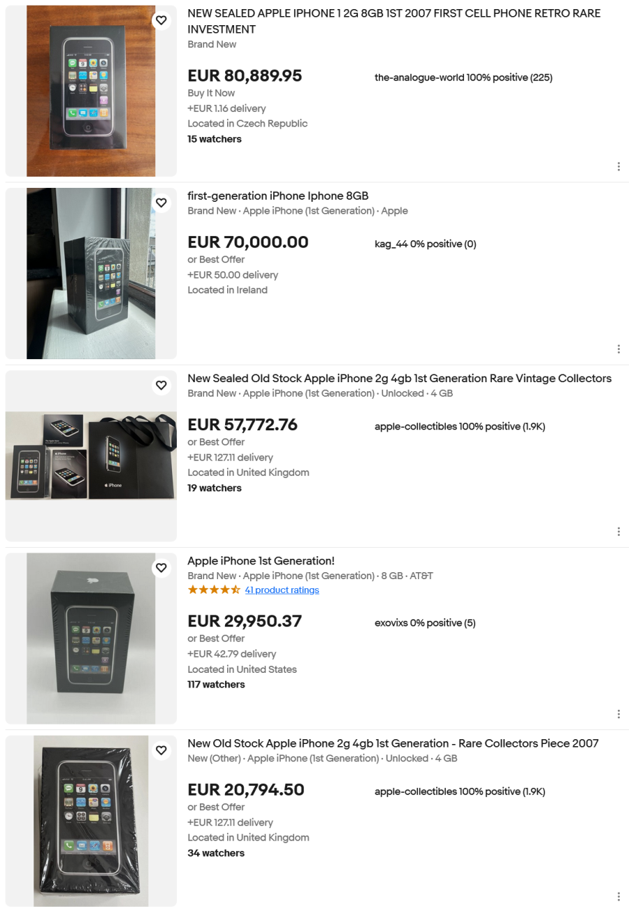 Χαρακτηριστική είναι η περίπτωση του πρώτου iPhone. Το εμβληματικό κινητό, σφραγισμένο στο κουτί, πωλείται σε τιμές έως 80.889 ευρώ! Δηλαδή περίπου όσο ένα διαμέρισμα. Μάλιστα κατά καιρούς έχουμε δει την τιμή του να σκαρφαλώνει και ακόμα πιο πάνω.