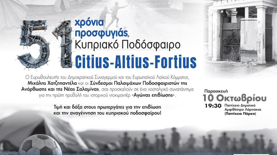 Η Λάρνακα είναι ο επόμενος μεγάλος σταθμός της εκδήλωσης «51 Χρόνια Προσφυγιάς, Κυπριακό Ποδόσφαιρο: Citius - Altius - Fortius». Θα διοργανωθεί την Παρασκευή 10 Οκτωβρίου, η ώρα 19:30, στο Παττίχειο Δημοτικό Αμφιθέατρο Λάρνακας (Παττίχειο Πάρκο).