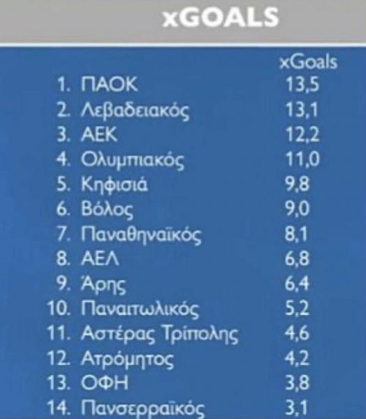 Την πεντάδα ολοκληρώνουν ο Παναθηναϊκός με 4,8 και 6 γκολ παθητικό, ενώ η ΑΕΚ που έχει δεχθεί μόλις 3 γκολ, έχει xGoals παθητικό 6,9 (!), κάτι που σημαίνει ότι στον συγκεκριμένο τομέα τα έχει πάει πολύ καλά.