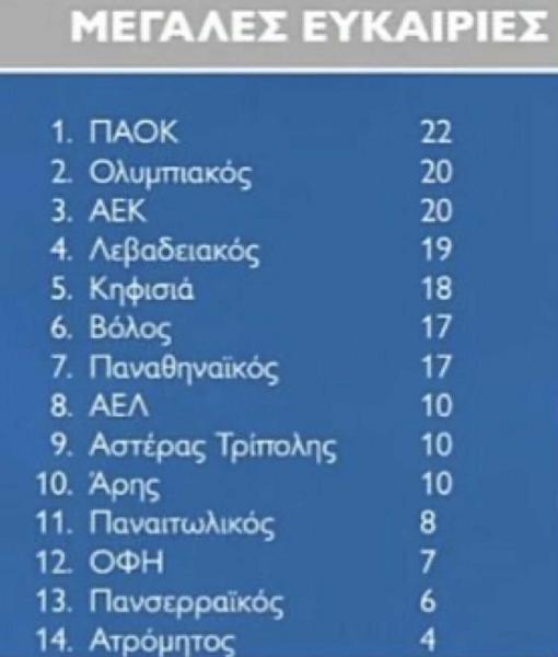 Ο Ολυμπιακός και η ΑΕΚ που ακολούθουν με 20 μεγάλες ευκαιρίες αντίστοιχα και 11,0 - 12,2 xGoals, έχουν σκοράρει 14 και 9 γκολ αντίστοιχα. Τουτέστιν, οι ερυθρόλευκοι είναι αρκετά αποτελεσματικοί, μιας και βρίσκουν δίχτυα περισσότερο από το... αναμενόμενο, ενώ η «Ένωση» δείχνει και αυτή ένα πρόβλημα στο εύκολο γκολ.