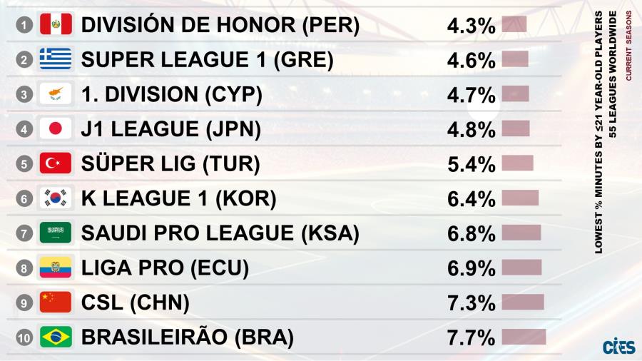 Αυτοί παίρνουν μέχρι στιγμής μόνο το 4,6% του συνολικού αγωνιστικού χρόνου, πίσω από το πρωτάθλημα του Περού (4,3%) και οριακά πάνω από αυτό της Κύπρου (4,7%) που έχει ακριβώς τις ίδιες παθογένειες.