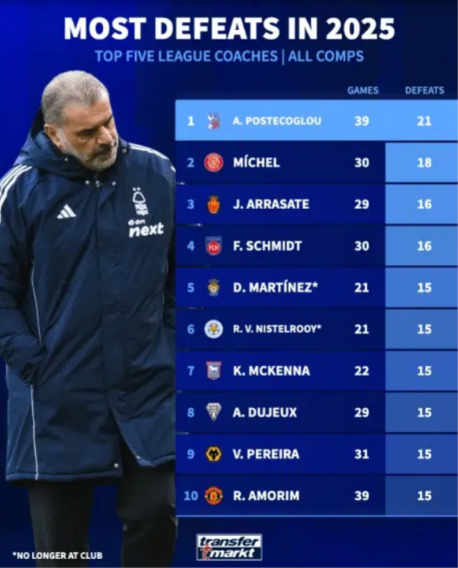 Συγκεκριμένα, ο Άγγελος Ποστέκογλου είναι ο προπονητής με τις περισσότερες ήττες σε όλες τις διοργανώσεις μέσα στο 2025, για τις ομάδες των πέντε κορυφαίων πρωταθλημάτων (Αγγλία, Ισπανία, Ιταλία, Γερμανία, Γαλλία).