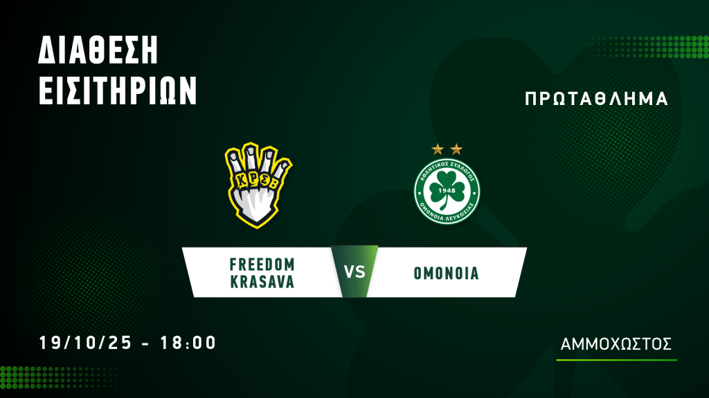 Από την Τρίτη, 14 Οκτωβρίου, στις 10:00, διατίθενται τα εισιτήρια του αγώνα με αντίπαλο την Freedom24 Krasava Ε.Ν.Υ, για την 7η αγωνιστική του πρωταθλήματος, που θα διεξαχθεί στο στάδιο “Αμμόχωστος – Επιστροφή”.