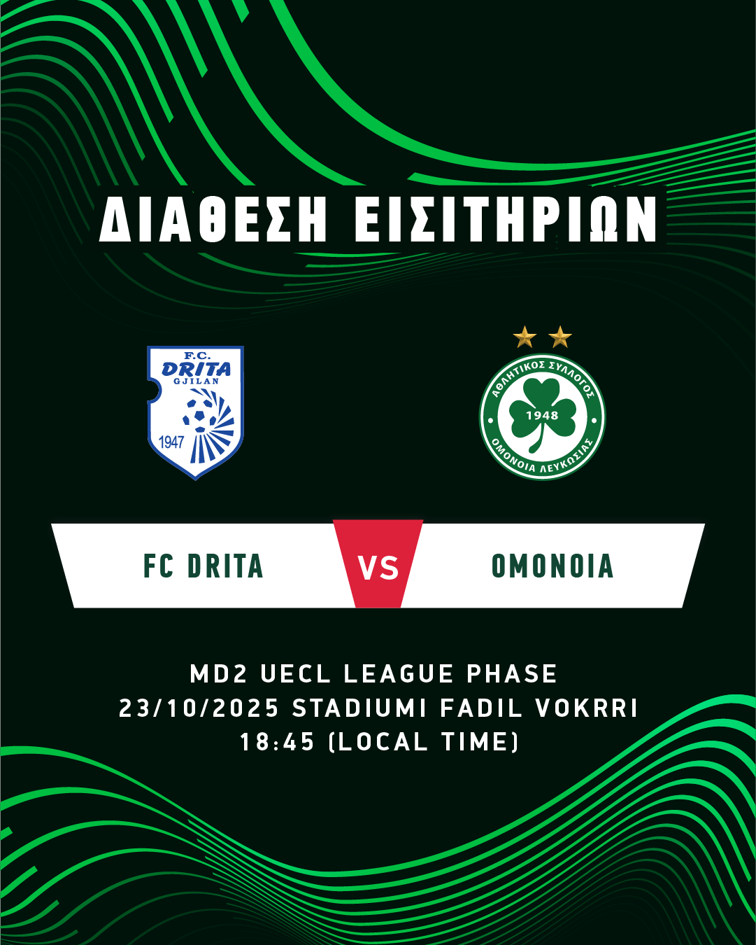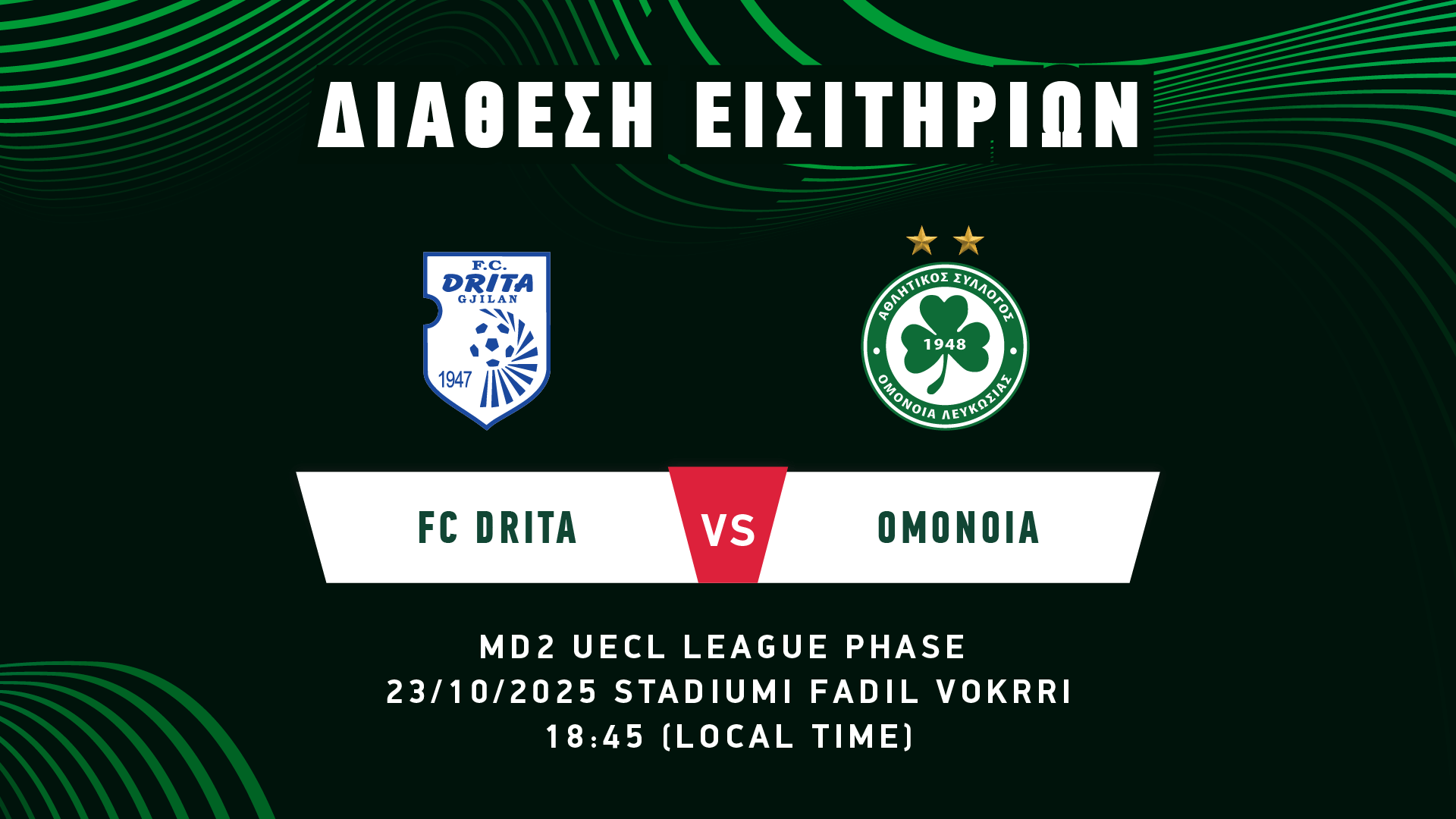 Από την Τρίτη, 14 Οκτωβρίου, στις 10:00, διατίθενται τα εισιτήρια για τον αγώνα με την FC DRITA, που θα διεξαχθεί στο στάδιο «Fadil Vokrri», στο Κόσοβο, την Πέμπτη, 23 Οκτωβρίου, στις 18:45, στο πλαίσιο της 2ης αγωνιστικής της League Phase του UEFA Conference League.