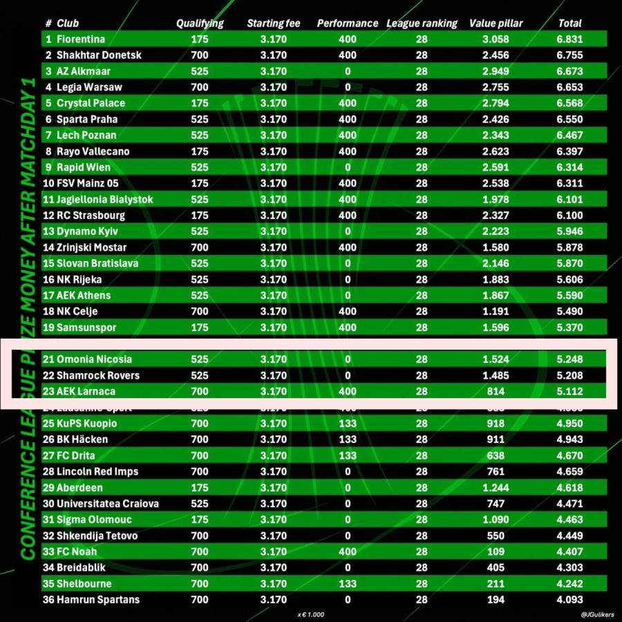Τα ποσά που εξασφάλισαν μέχρι τώρα οι ομάδες που προκρίθηκαν στη League Phase του Conference League δημοσιεύτηκαν σε ρεπορτάζ του εξωτερικού.