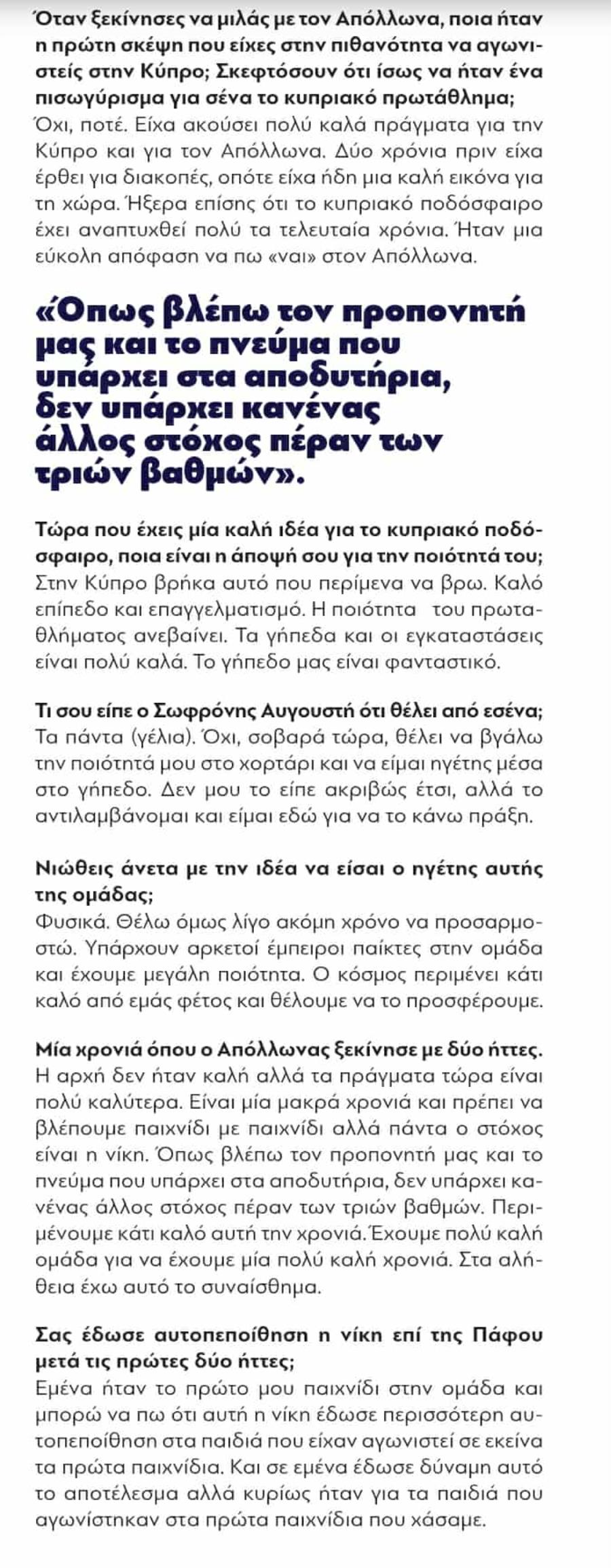 Μεγάλη συνέντευξη έδωσε ο Μάρκοβιτς στο περιοδικό του Απόλλωνα.