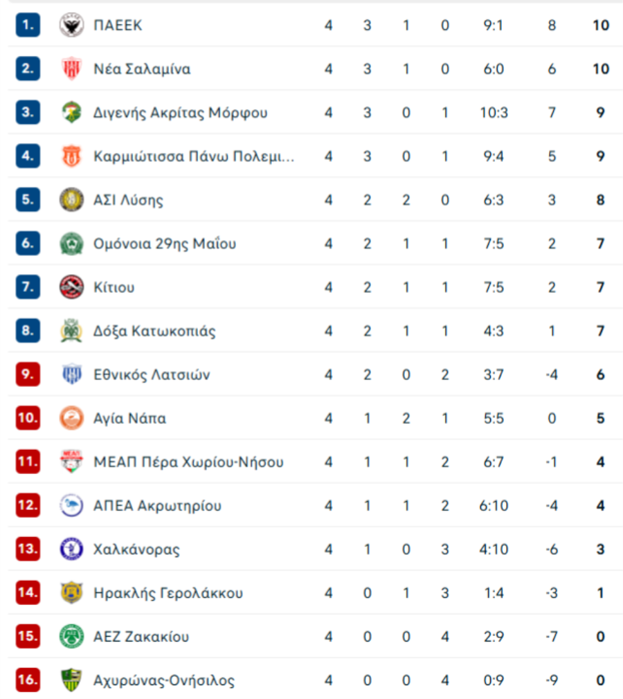 Η ΒΑΘΜΟΛΟΓΙΑ μετά από τέσσερις αγωνιστικές: