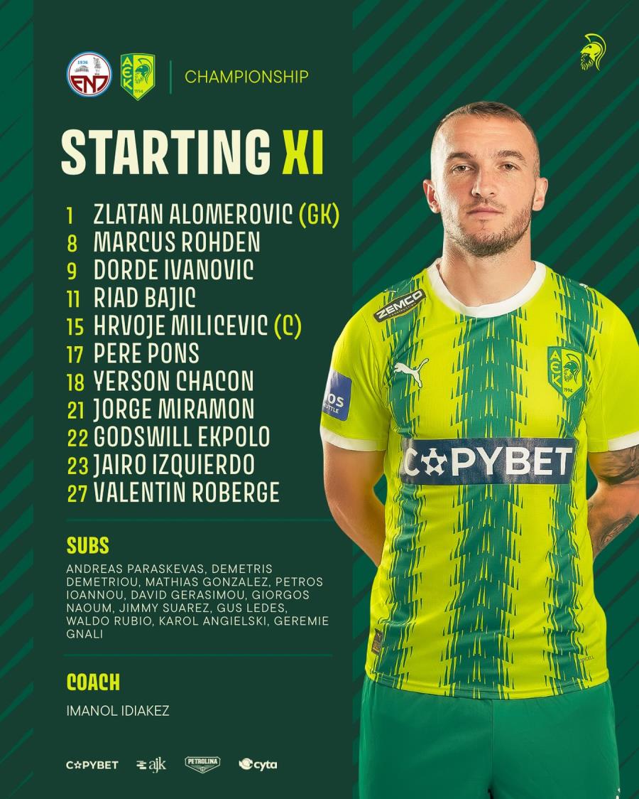 ΑΕΚ: Αλομέροβιτς, Ροντέν, Ρομπέρζ, Εκπολό, Ιβάνοβιτς, Μιλίσεβιτς, Πονς, Τσάκον, Μιραμόν, Ιθκιέρδο, Μπάγιτς