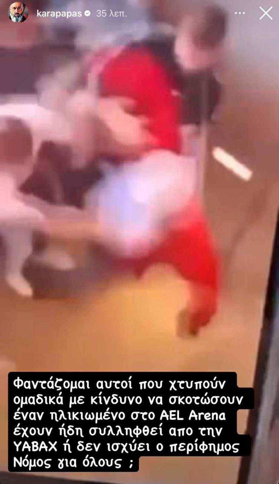 «Φαντάζομαι αυτοί που χτυπούν ομαδικά με κίνδυνο να σκοτώσουν έναν ηλικιωμένο στο AEL Arena έχουν ήδη συλληφθεί από την ΥΑΒΑΧ ή δεν ισχύει ο περίφημος νόμος για όλους;», έγραψε χαρακτηριστικά.